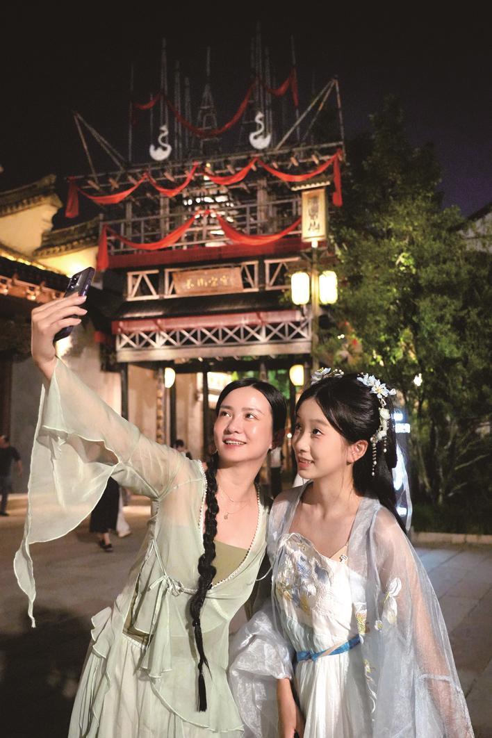 10月7日晚,濮院时尚古镇内,身穿汉服的游客在合影留念。
