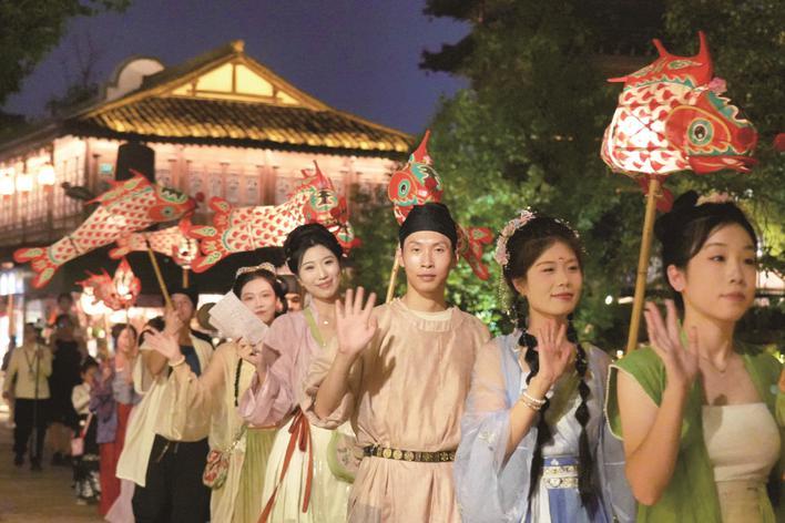 10月7日晚,濮院时尚古镇内,演员们身穿汉服进行名为“濮院梦华录”的专题演出。