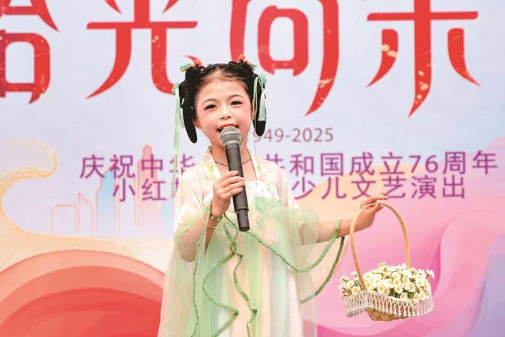 10月1日,为庆祝新中国成立76周年,嘉兴市青少年宫举办“小红帆大舞台少儿文艺演出”活动,图为身穿汉服的小朋友为祖国献歌。