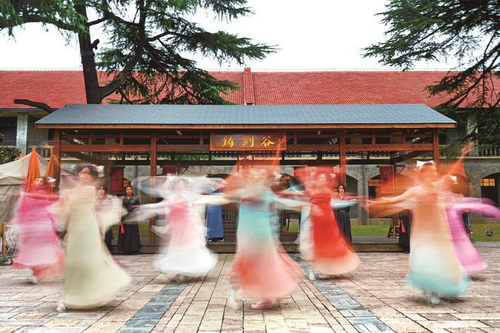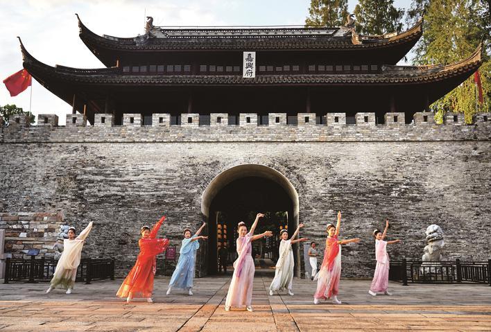 9月25日,在嘉兴市区子城广场上,身穿汉服的演员们翩翩起舞。
