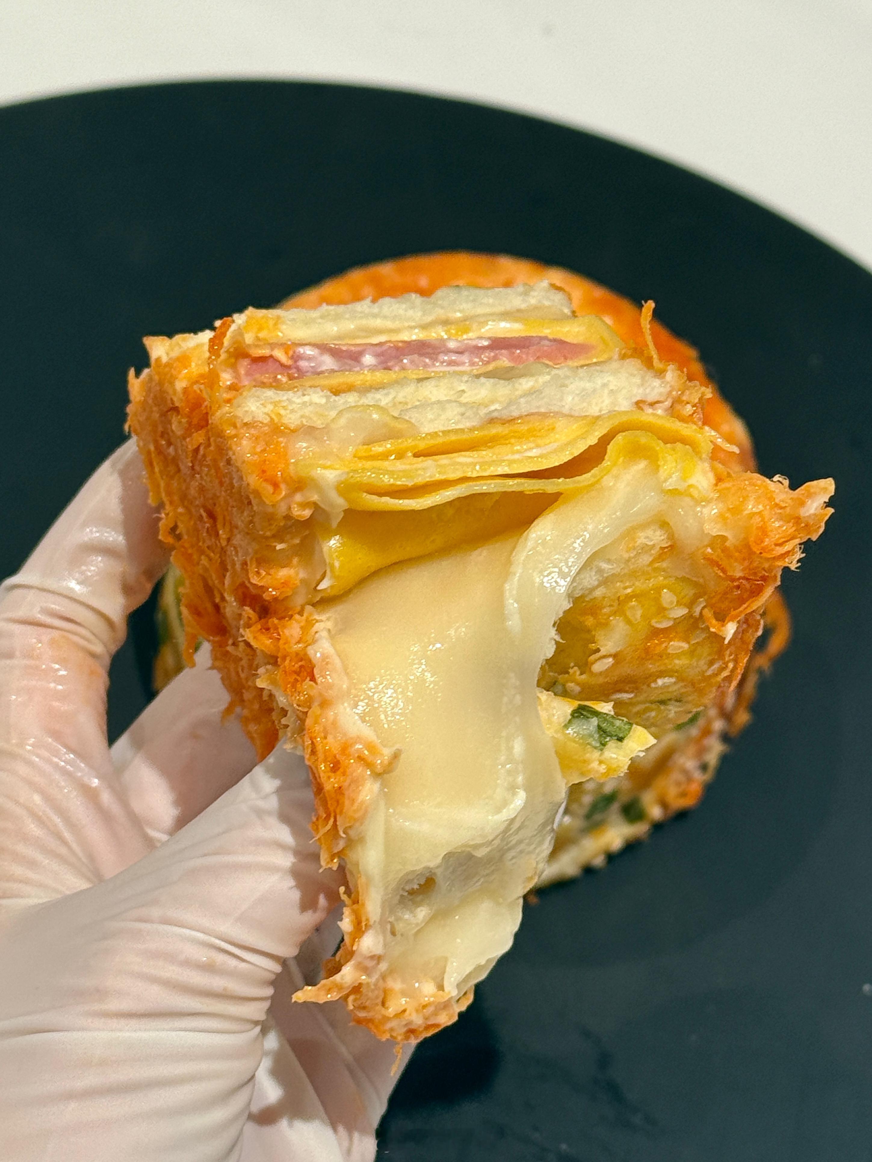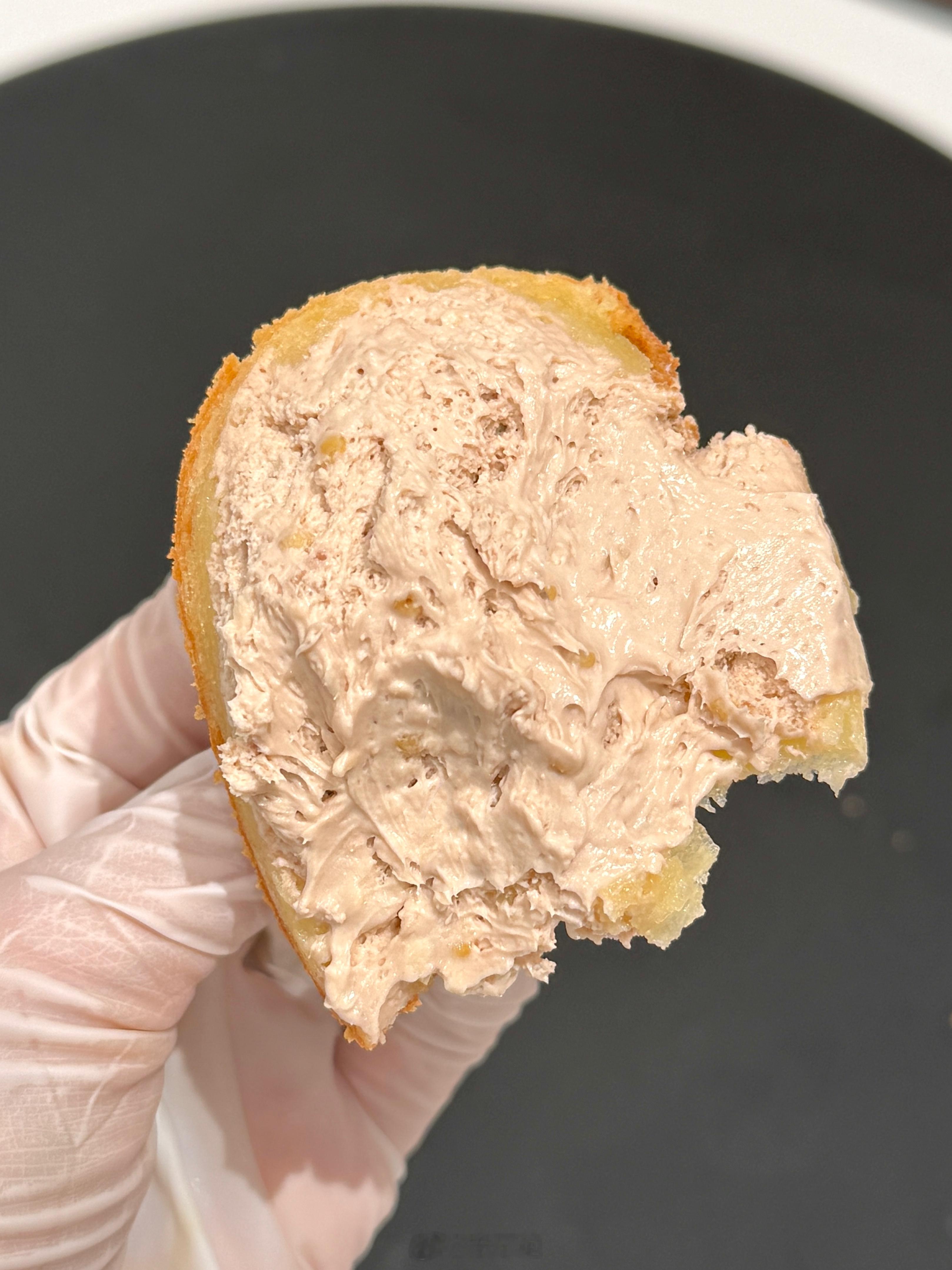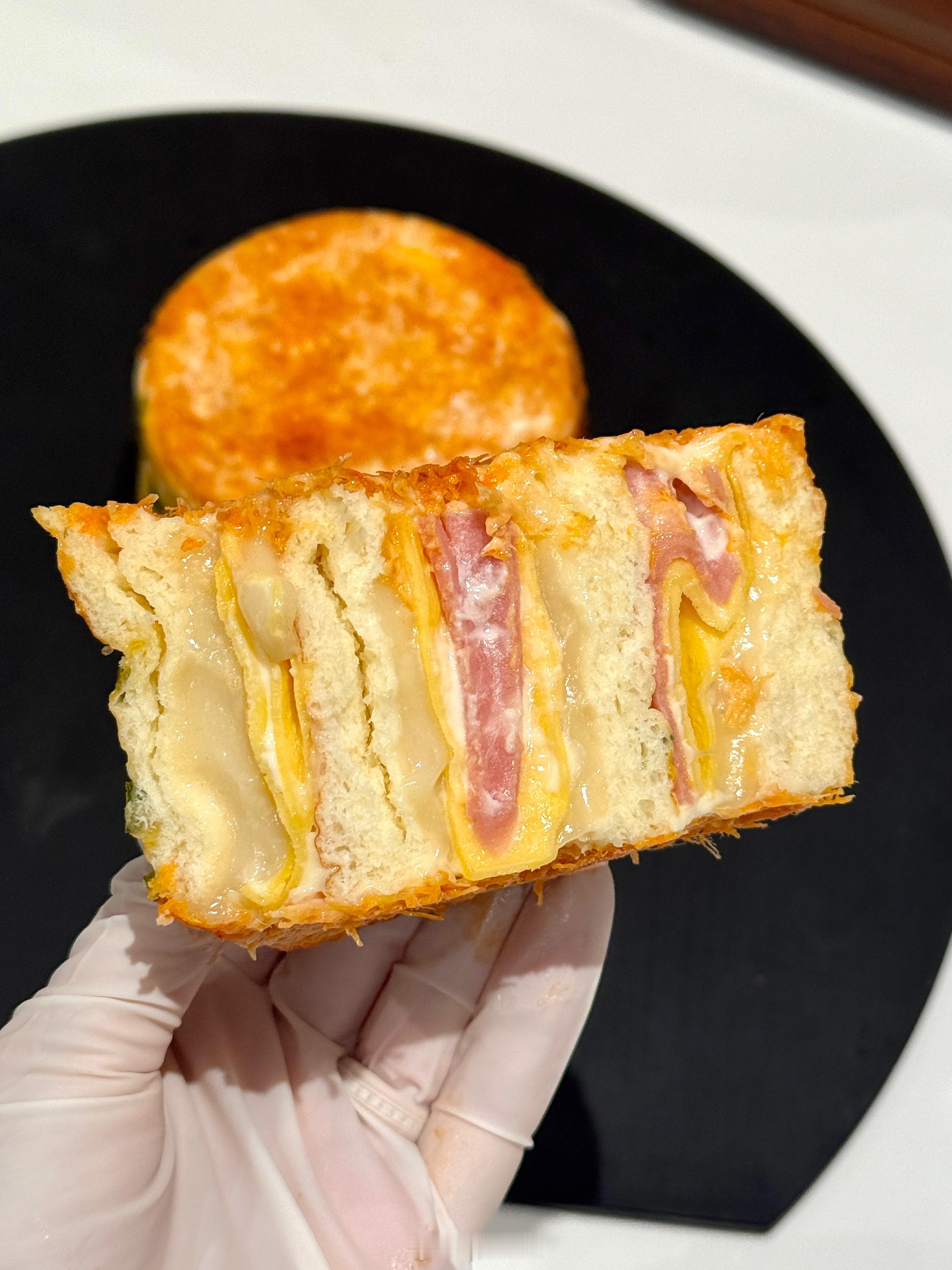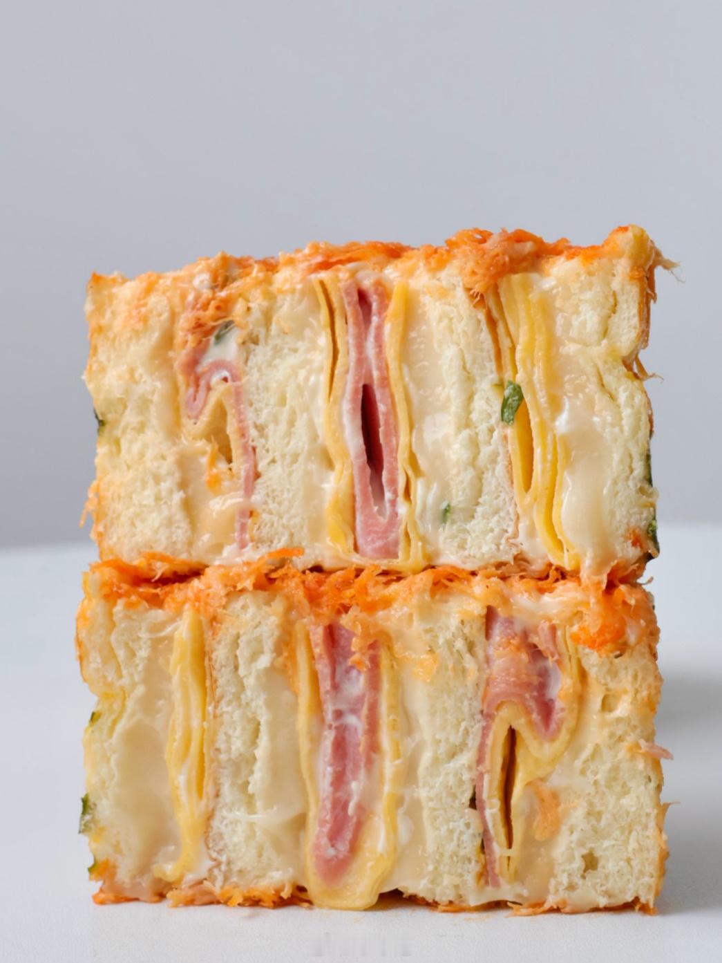 又在肉松卷上整花样了,松软香葱肉松面包体搭配超薄的千层蛋皮和火腿片,还有无敌拉丝的鲜奶麻薯,我打保票!每一个肉松脑袋吃一口都会爱上的程度!