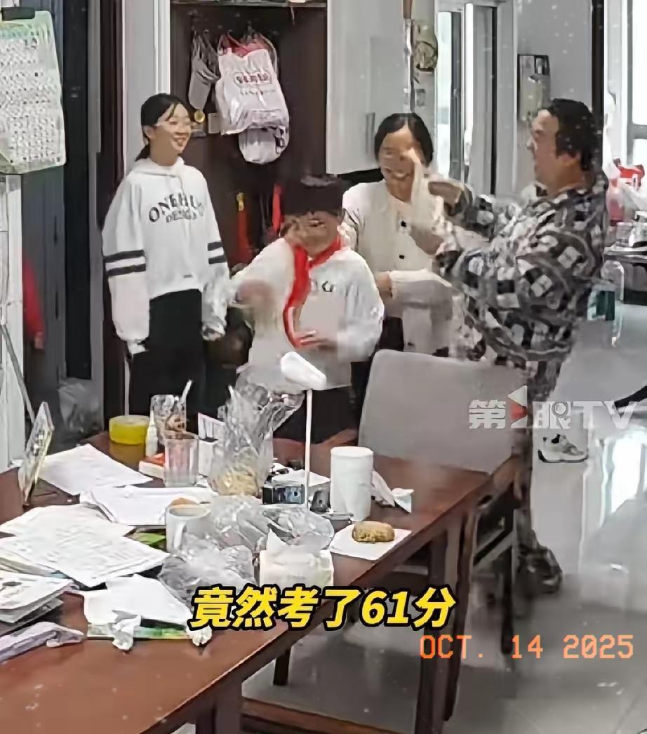 这种家庭氛围真好!安徽亳州,孩子考了61分,妈妈拿着试卷推门就对着丈夫喊,“梁医生,你家祖坟冒青烟了!你家孩子及格了,考了61分!” 爸爸“腾”的一下子从椅子上坐起来,接过试卷看了看后,激动的冲孩子喊,“我的孩啊,你这光宗耀祖了。 监控镜头记录下的这段家庭对话,短短几天内火遍全网。安徽亳州的梁医生一家,用一场为61分而设的狂欢,触碰了千万家长心中最敏感的那根弦。 梁医生是一名儿科医生,十年医院工作的经历让他对生命和教育有着截然不同的理解。 “我们在医院里面工作,见了不少抑郁的小孩。我见过很多父母在病床旁边后悔莫及的样子,感触非常深。”他在接受采访时坦言。长期在医院工作,目睹了太多生死离别,见过许多后悔莫及的父母,这让他对孩子的成长有了不一样的感悟。 梁医生直言不讳:“我自己本身就不是100分的父母,干嘛非要孩子都是100分。” 在他看来,孩子的每一次进步都难能可贵,这次考61分,是孩子努力的证明,值得好好鼓励。 这位医生爸爸对孩子的成绩不是要求特别高,只要他们健康成长就行了。他更看重孩子做人做事这方面的东西,只要做一个正直的人就行了。 视频中,妈妈兴奋地向爸爸报喜,爸爸立刻响应,激动地大喊“光宗耀祖”,还要给爷爷奶奶打电话报喜,决定全家下馆子庆祝。 对于平时成绩不太理想的孩子来说,61分确实值得庆祝。 这是他四年级第一次月考,数学一直不好很难及格。这次及格对他们来说是一个巨大的进步。 梁医生一家有三个孩子,两个儿子和一个女儿,最小的刚上一年级。他透露,孩子们的成绩都“半斤八两”,有时候也能及格。 梁医生不建议“唯分数论”,他认为这样会让孩子太累。 “我真的不希望社会上再发生这种事情。”他见过不少焦虑的孩子,不希望这样的悲剧重演。 这位医生父亲的教育理念恰好契合了2022年实施的《家庭教育促进法》的要求。该法明确规定,家长应当合理安排孩子的学习、休息、娱乐和体育锻炼时间,避免加重未成年人学习负担。 梁医生不仅关注学习成绩,更重视孩子的个性发展和兴趣培养。 “我大女儿画画就特别好,每周都在画室上课。二儿子口才不错,他在学口才,我感觉学得还挺不错的。 视频走红后,网络上掀起了讨论热潮。许多网友对这位父亲的教育理念和情绪价值给予高度赞扬。 一位网友评论说:“这才是正确的教育观!孩子需要的是鼓励和认可,而不是一味地被分数绑架。在这样充满爱的家庭里长大,孩子一定很幸福。” 也有人调侃:“考61分就下馆子,那考100分不得办个大派对。” 不过,也有少数家长对此表示难以理解,觉得61分的成绩并不值得如此大张旗鼓地庆祝。 有家长坦言:“鼓励进步是好的,但61分毕竟只是刚及格,这么庆祝会不会让孩子觉得‘差不多就行’? 面对质疑,梁医生的回应带着医生特有的通透:“我们庆祝的是进步,不是61分这个数字。如果下次考60分,我们会一起分析原因,再鼓励他努力。” 饭馆里,一家人围坐一桌,餐桌上摆满孩子爱吃的菜肴。那个曾经因成绩不佳而垂头丧气的孩子,此刻脸上绽放着自信的笑容。 各位读者你们怎么看?欢迎在评论区讨论。