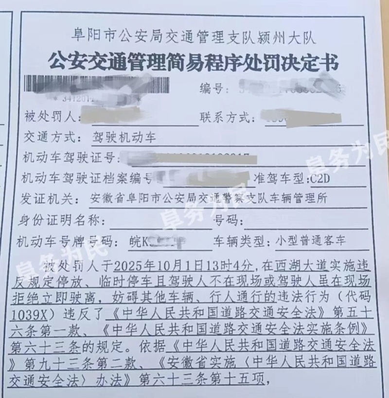 10月13日,记者从阜阳市交警部门获悉,辖区民警根据网友提供的证据,确认问题属实后,联系该车驾驶员。对该驾驶员进行了违停处罚与批评教育。