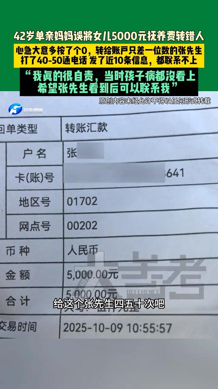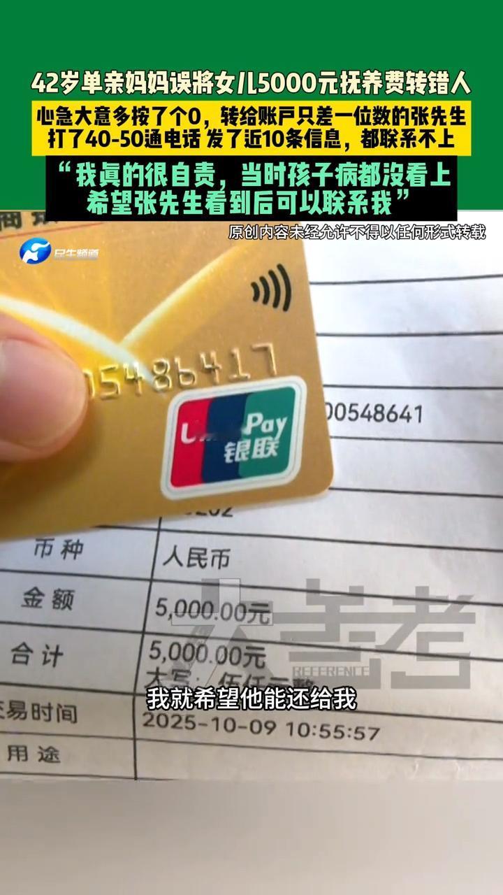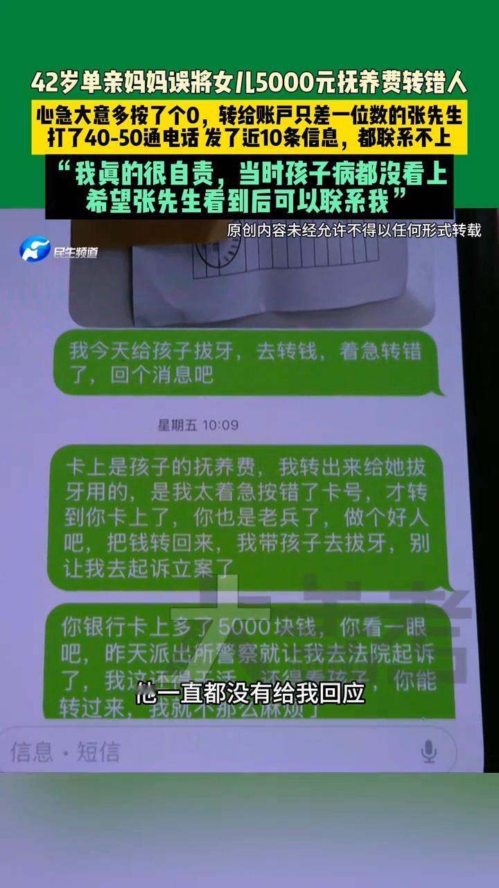 太糊涂了! 42岁的单亲妈妈转账5000元带孩子看病,结果输卡号多按了一个0,转到了陌生人账户,给对方联系了四五十次,都不肯还钱,最后女儿病也没看上。 熊女士早年离异,自己独自一人抚养女儿,前夫给孩子转来5000元抚养费,刚好女儿病了,熊女士就带着女儿去看病。 可是转账的时候,熊女士一时疏忽,输卡号的时候多按了一个0,结果5000元直接转给了一个姓张的陌生男子。 熊女士给男子打短信、打电话,前后起码联系了四五十次,但是男子就是不回复。 熊女士和对方说了自己的处境,也表明这笔钱是孩子的抚养费,也是孩子准备看病的钱,可是对方依旧无动于衷。 熊女士最后只好含泪带着女儿回了家,病也没看成。 就干活去了,对方仍然不回复消息。 这件事虽然是因为熊女士操作不当导致,但是陌生男子的行为确实也不妥。 根据我国《民法典》第122条相关规定,熊女士错转5000元,这名男子如果拒不返还,将会构成“不当得利”,熊女士是有权要求其返还钱款。如果对方恶意占有(如明知转错仍转移资金),可能涉嫌侵占罪,可追究刑事责任 。 熊女士现在应该做的是直接报警,请警方介入处理。 如果对方仍然不肯归还,可想法院提起诉讼,起诉这名陌生男子,并要求强制执行。 虽然时效性可能会慢一点,但是也是没有办法中的办法了。 希望熊女士能吃一堑长一智,不要再犯类似错误了。 涉及到转账等资金变动时,一定要仔细仔细再仔细。