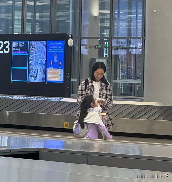 44岁朱丹和女儿现身机场,她的穿衣打扮朴素,脸上纯素颜,皮肤好黄,气质土土的,还