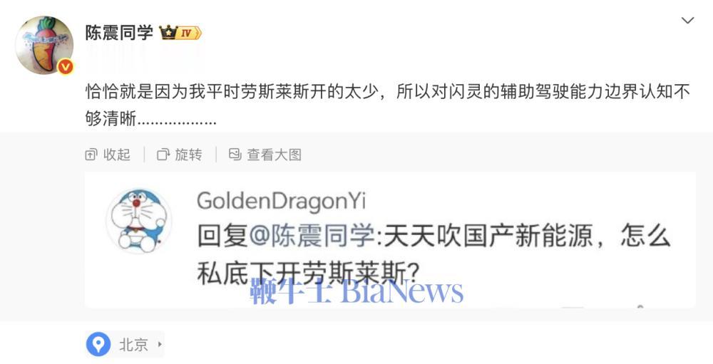昨日晚间,陈震在微博发文,透露其驾驶劳斯莱斯闪灵发生逆行事故原因是用了辅助驾驶。陈震表示“恰恰就是因为我平时劳斯莱斯开的太少,所以对闪灵的辅助驾驶能力边界认知不够清晰。”