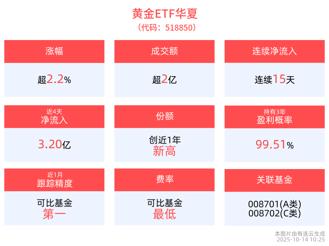 统计显示,随着金价走强,近日金银有色等产品持续获资金布局,截至10月13日,黄金ETF华夏近15天获得连续资金净流入,合计“吸金”8.73亿元,黄金股ETF基金(159562)9近4日连续获资金净申购,累计吸金3.24亿,有色金属ETF基金(516650)近7日连续获资金净申购,累计吸金达9.03亿。