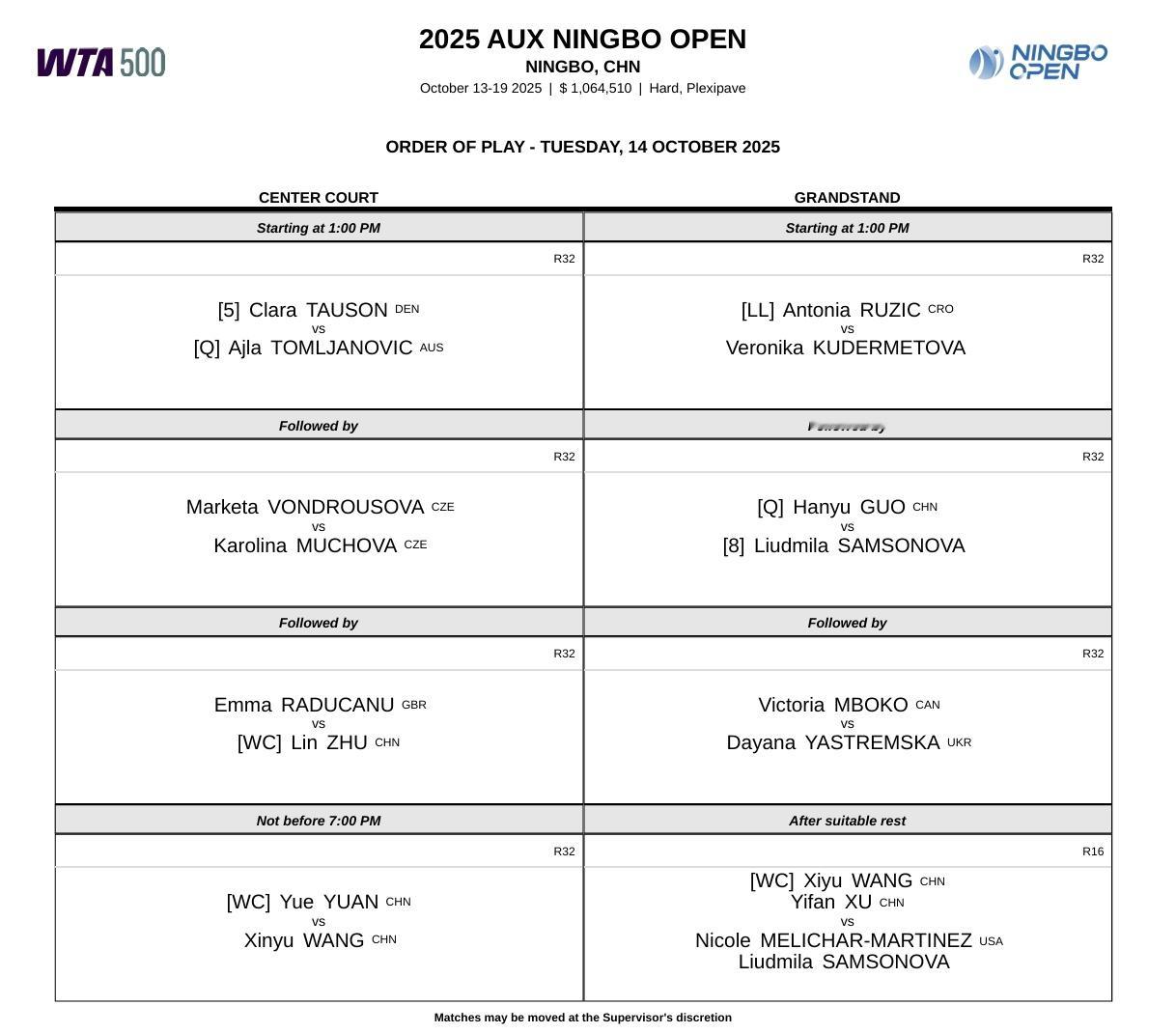 她的签位将由幸运落败者鲁季奇替代,后者将在首轮对阵库德梅托娃。今日赛程随之进行调整,陶森和汤姆贾诺维奇的对决将在中心场第一场进行。