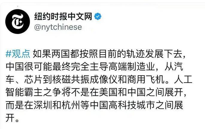 如果两国都按照目前的轨迹发 展下去中国很可能最终完全主导高端制造业,从汽车、芯片到核磁共振成像仪和商用飞机。人工智能霸主之争将不是在美国和中国之间展开而是在深圳和杭州等中国高科技城市之间展开。 过去我们一提到高端车型、自动驾驶、核心动力系统,脑海里浮现的还是欧美品牌。 可是最近几年,随着新能源技术的迭代,中国不仅量产了数以百万计的电动汽车,还解决了关键环节中的电池组、动力总成和智能座舱问题。 别忘了,现在全球最大的动力电池厂商在中国,哪家国际车企想要发展新能源,绕不开中国的供应链。 国际合作不再是技术输出,而是对等互惠,甚至开始倒向中国主导,说中国汽车只是“制造牛”,已经不准确了,创新和定义产业规则的能力正在显现。 芯片产业,虽然短期内中国还无法全面追赶全球最尖端技术,但从设备、设计、工艺到封装测试,国内企业的成长速度非常惊人。 很多高端消费电子、车载芯片应用,中国供应商基本可以做到自主可控。 中国的新型封装技术、多元化的半导体材料突破,正悄然推动芯片行业向多领域扩张,一批企业正在“卡位”未来的分布式计算、人工智能大模型等新方向。 产业升级不是停留在嘴上,而是用一代代具体产品和方案把差距缩小,最终实现赶超。 医疗设备方面,有人说高端器械离不开欧美巨头,可是在核磁共振等领域,中国企业已经不仅能做出性价比极高的产品,还能不断实现创新。 无论是影像处理、平台融合,还是远程诊断和智能辅助,国内玩家正把“技术壁垒”变成“可普及方案”,让设备从医院端扩展到基层。 对于中国来说,这种底层技术的突破特别关键,因为它能推动医疗服务体系的升级,也让高端医疗不再是大城市的专属标签。 航空制造可能是最后一个被国际社会广泛认可的“技术大山”,比如商用干线飞机,发动机、航电系统复杂到令人咋舌。 然而中国的飞机制造体系已经日益成型,不仅造得出机体,还在关键部件上实现了自主供应。 虽然和老牌航空强国相比还有不少细节和成熟度的差距,但你如果了解现代航空供应链,就能看到中国企业在全球分包体系里的逐步强化。 航空产业不是一招鲜吃遍天,而是多个技术环节打通,最终形成完整产业链,让创新和制造能力成为可持续的,几年后,国产商用飞机上市不会只是象征性突破,而是开启新一轮全球竞争。 人工智能并没有像过去那样继续由美中两国之间“领跑”,而是在中国的多个科技城市之间悄然展开。 “深圳速度”和“杭州模式”成为一种现象级标签,全国各地的数据集、算力供给、算法模型都在这里汇聚,产业龙头公司、一线应用场景层出不穷。 现在中国的AI创业环境和基础设施,远超很多人的想象,创新楔入点从医疗影像、工业自动化、智能机器人再到教育和内容生成,多地持续涌现出世界级的独角兽。 很多AI巨头并不只是做技术,还是产业标准的制定者,这意味着全球未来的规则和算法路径极可能由中国高科技城市共同主导。 美国硅谷曾经引领全球,现在“深圳—杭州轴线”正在悄然成为新的创新坐标。 如果我们只用传统的“中美双寡头”模式理解未来科技霸权,已经跟不上现实的步伐。 当深圳、杭州、苏州、甚至重庆、成都这些城市成为创新主角,各自领域的龙头企业都能在全球产业链中构建自己的技术和生态堡垒。 以AI为代表的新一代高科技不会被一种纯粹的国家竞争束缚,反而更像区域创新网络的较量。 中国高科技城市之间的角逐才刚刚开始,未来谁能把技术成果转化成产业落地、生态平台和全球标准,谁就有可能引领整个全球高端制造的走向。 你觉得哪些中国城市会成为下一个全球创新中心? 信息来源:纽约时报中文网