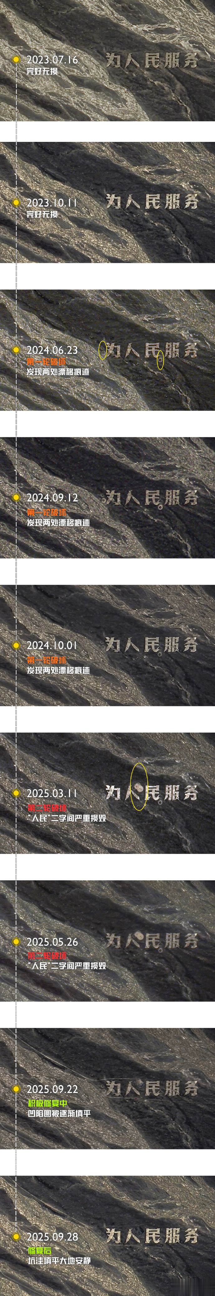 10月14日,“长光卫星”官方账号晒出修复前后对比图并发文称:“吉林一号”卫星记录哈密戈壁滩“为人民服务”大字破坏、修复全过程。2024年,哈密戈壁滩“为人民服务”大字逐渐遭人开车漂移破坏。越野爱好者在标语上肆意漂移,留下了一个个刺眼的圆圈痕迹,尤其是“人民”二字中间的地貌破坏极为严重,留下的沟壑深度可达一掌,不仅破坏了戈壁景观,更是对历史和先辈的亵渎。