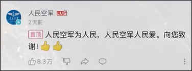 人民空军官方账号留言回应:人民空军为人民,人民空军人民爱,向您致谢!