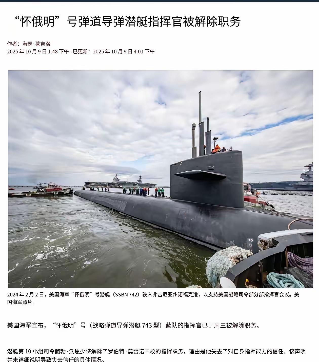 美国海军司令部证实,10月8日已对美国海军俄亥俄级弹道导弹核潜艇怀俄明号(SSBN - 742)的蓝组艇长罗伯特·莫雷诺中校,被第10潜艇大队指挥官鲍勃·沃斯准将给撤职了,理由是对指挥作战“失去信心”。 我们都知道,自从055大驱在2020年1月12日正式入列服役后到2025年的现在为止的5年间,与它打过照面进行过真实对抗的美军海军军舰和航空母舰关键部门已经有数十名舰长和指挥官被以“失去指挥作战信心”的原因撤职,但像俄亥俄级核潜艇这种美国的镇国重器的艇长也被以“失去信心”撤职还是头一遭,这说明美国核潜艇也像美军海军的水面舰船遇到了055一样遇到了足以让它们失去对抗能力进而丧失战斗意志的强劲对手。 这个强劲对手是谁?法国海军新闻网站当天报道,称美核潜艇艇长被撤职与在中国三亚军港出现的二艘神秘的AJX002无人潜艇有直接关联,而其提到的无人潜艇就是在九三阅兵展示的AJX002。由于九三阅兵展示的武器都是现役部队使用的武器装备中抽调的,所以,美军俄怀明号核潜艇遇到的就是AJX002是合理的推测——它们对抗过! 说到这不由地想起美国战争部长赫格塞思日前称,美军有钢铁意志,靠着钢铁意志可以取得一个又一个胜利。现在,一名美国镇国重器上艇长被以“失去信心”为由撤职,他的话成了天大的笑话。 说实话,钢铁意志绝对是这个世界上所有军队最为高贵的奢侈品格,不是谁说拥有就可以拥有的,它是在和从血与火中锻造和走出来。美军,它不行!