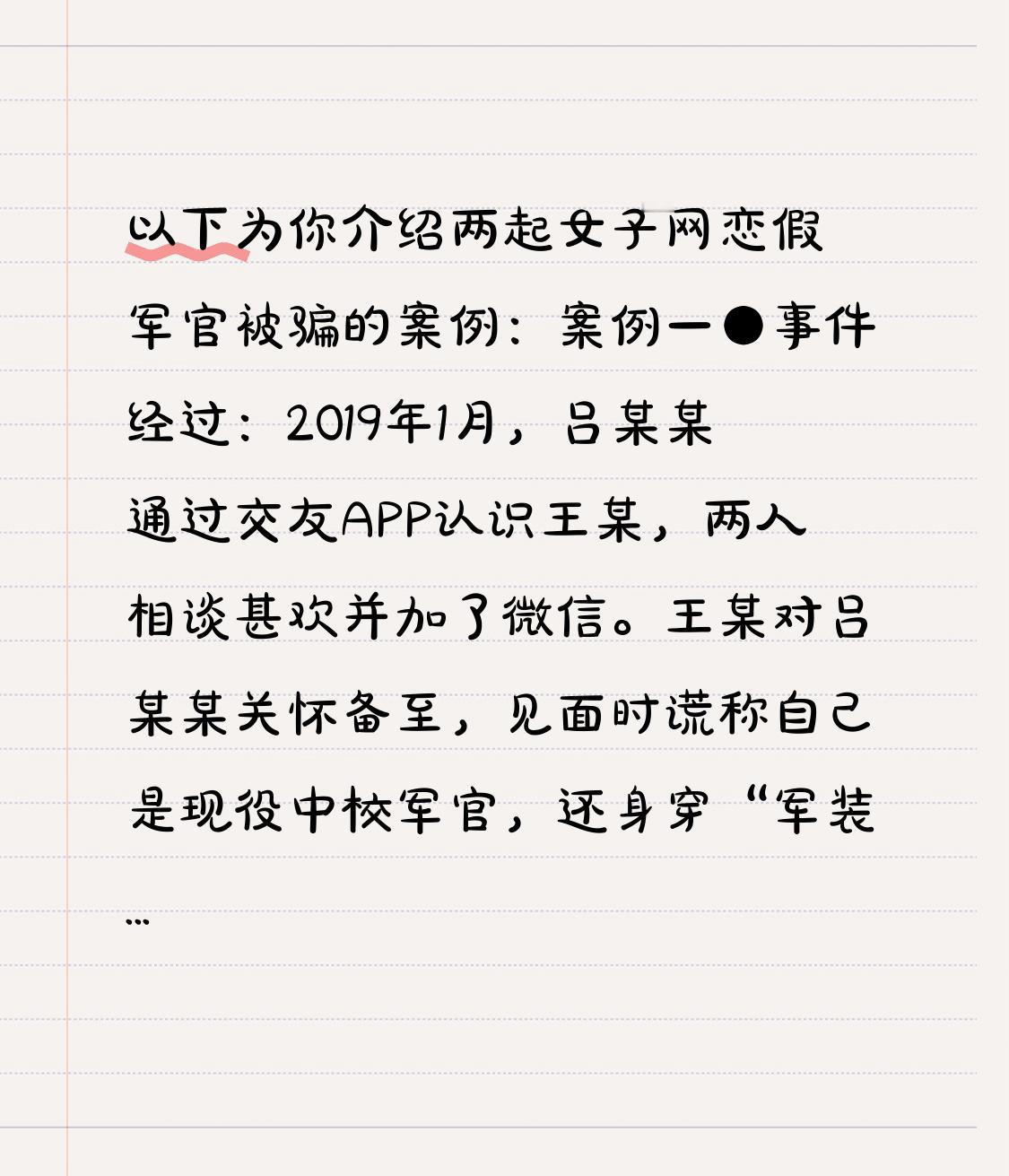 以下为你介绍两起女子网恋假军官被骗的案例: 案例一 ●事件经过:2019年1月,吕某某通过交友APP认识王某,两人相谈甚欢并加了微信。王某对吕某某关怀备至,见面时谎称自己是现役中校军官,还身穿“军装”,让吕某某“无意”看到其包内的“军官证”,取得吕某某信任后确立恋爱关系。2019年3月起,王某以宴请他人吃饭缺钱、个人消费和生意资金周转、虚构部队转业安置工作需跑动关系、父亲心脏安装支架手术、母亲生病、卖房变更户名等各种理由向吕某某“借钱”。 ●诈骗金额:自2019年3月6日至2019年12月31日,王某骗取吕某某个人储蓄、亲朋好友借款及网络平台贷款的资金共计344458元,这些钱被王某用于个人消费、生意周转、工程投资等。 ●后续进展:吕某某报警后,王某因涉嫌诈骗罪被列为网上逃犯后逃跑。2022年,夹江县公安局研判逃犯信息获知了王某的活动轨迹,在成都市金牛区某小区将其抓捕,案件在进一步办理中。 案例二 ●事件经过:2024年6月,冯某某在社交网络平台上与自称“徐言怀”的军官相识,对方发来穿军装照片并讲述部队生活,吸引冯某某与其建立恋爱关系。感情升温后,“徐言怀”以部队取钱不便为由,要求冯某某提供银行卡代收资金,并帮忙购买黄金邮寄至指定地点。冯某某家属提醒资金可能是违法所得,已婚的她虽察觉“徐言怀”可能从事违法活动,但受“分一杯羹”的贪念驱使,不仅提供银行卡接收资金,还分两次购买了价值共计40余万元的黄金并按指示寄出。 ●诈骗金额:“徐言怀”与多名被害人网恋进行诈骗,其中两名被害人被骗金额共达80余万元,被骗钱财未追回。 ●后续进展:被害人报警后警方顺藤摸瓜找到冯某某并将其逮捕。2025年6月26日,法院判决冯某某犯掩饰、隐瞒犯罪所得罪,判处有期徒刑两年,“徐言怀”仍在抓捕中。骗感情经历 网络恋情骗局 婚恋型诈骗 网络婚恋诈骗 交友平台诈骗 退伍军人骗局 伪爱情骗局