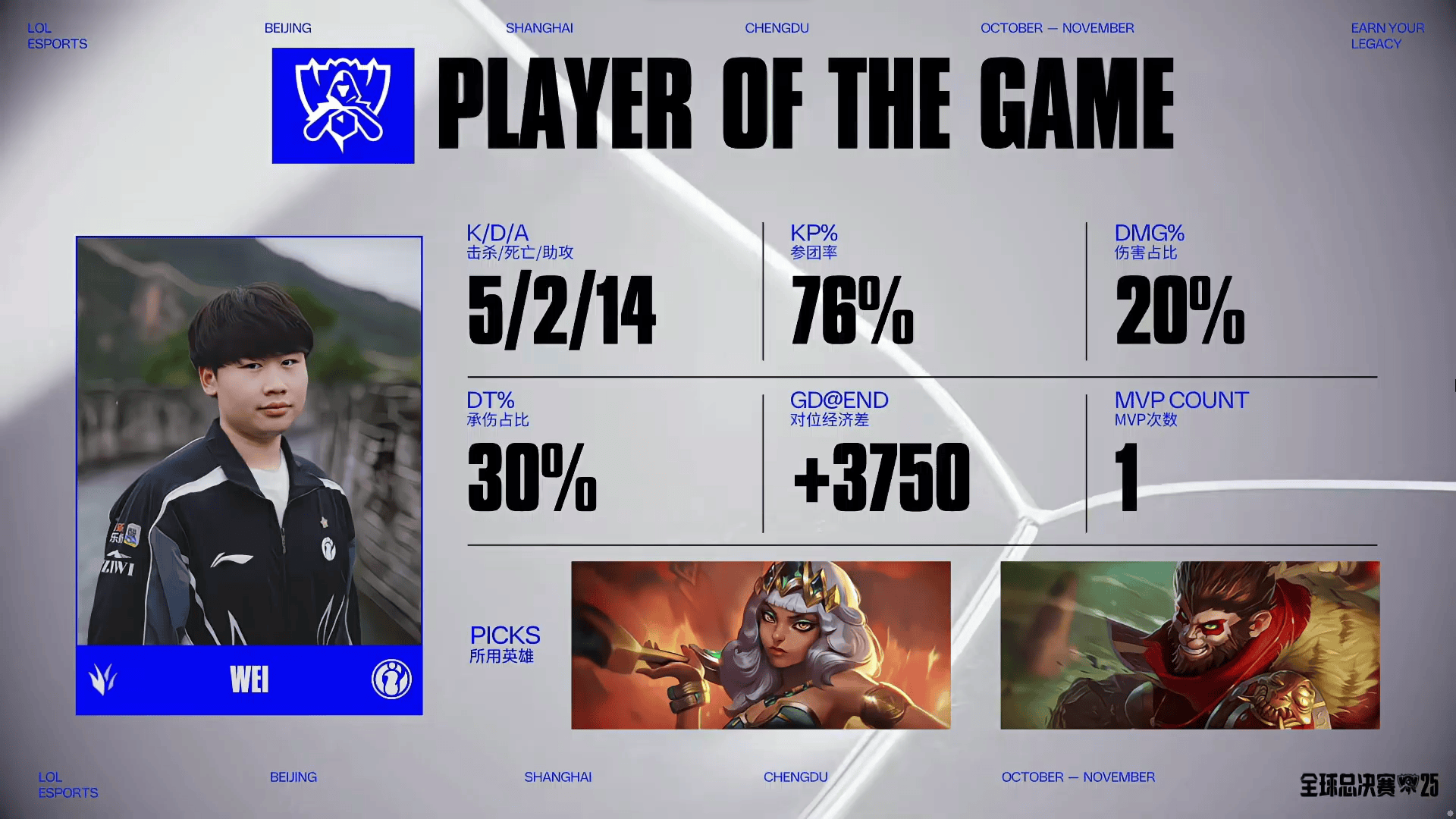 Wei猴子砍下5/2/14的战绩,拿下IG对阵T1第二局MVP
