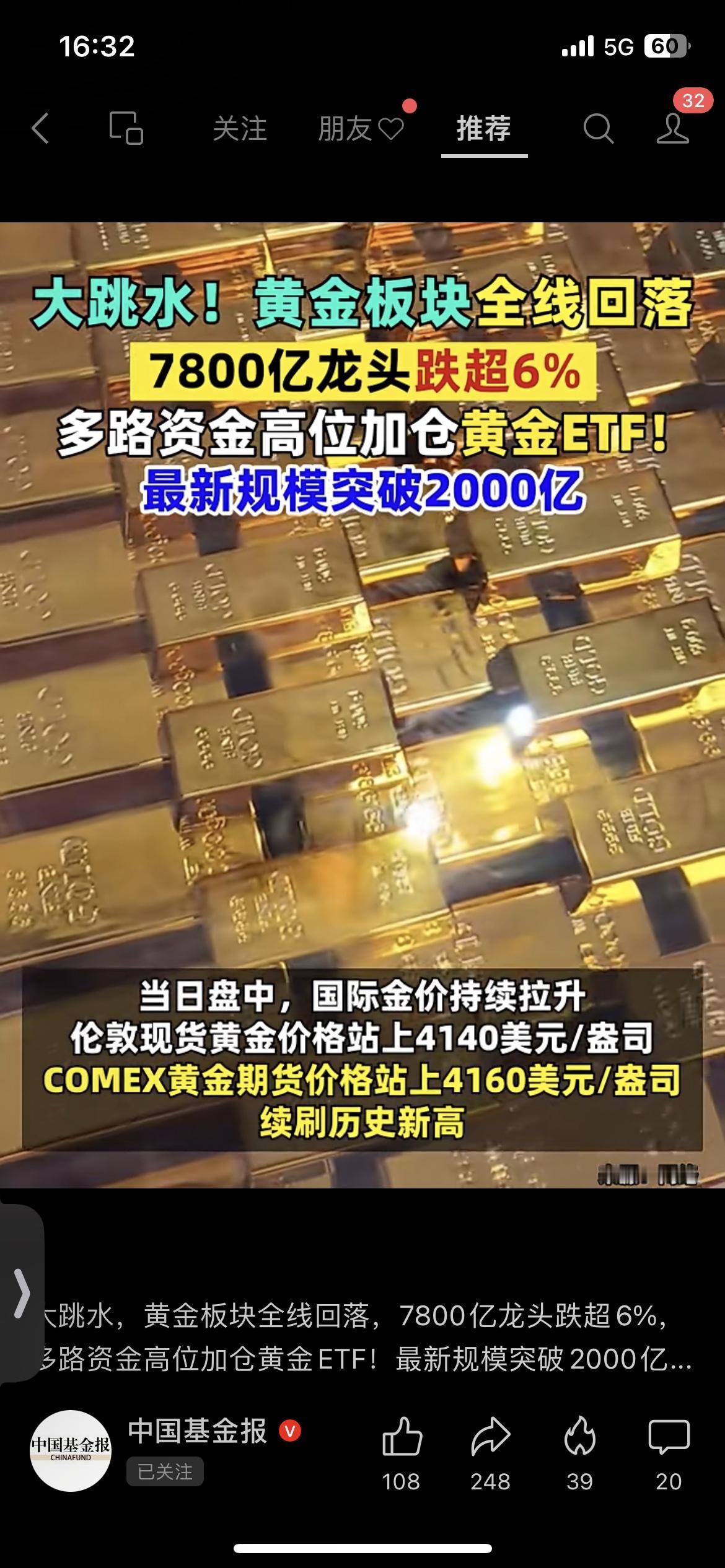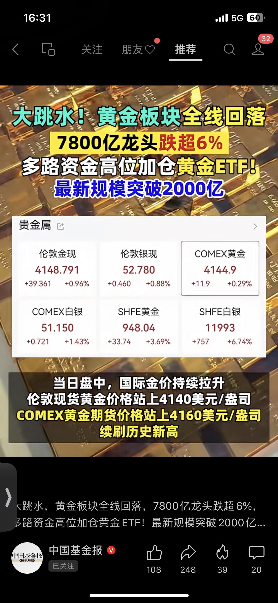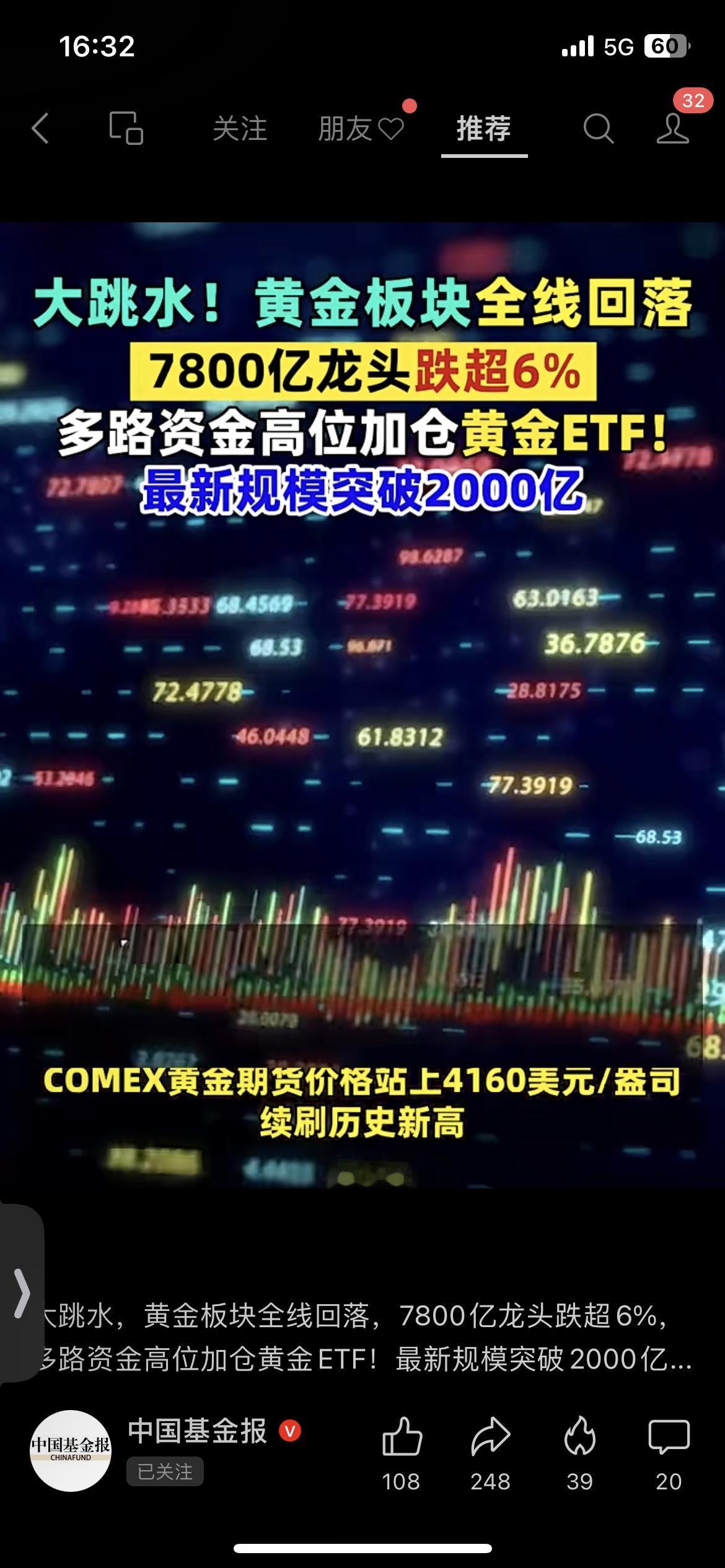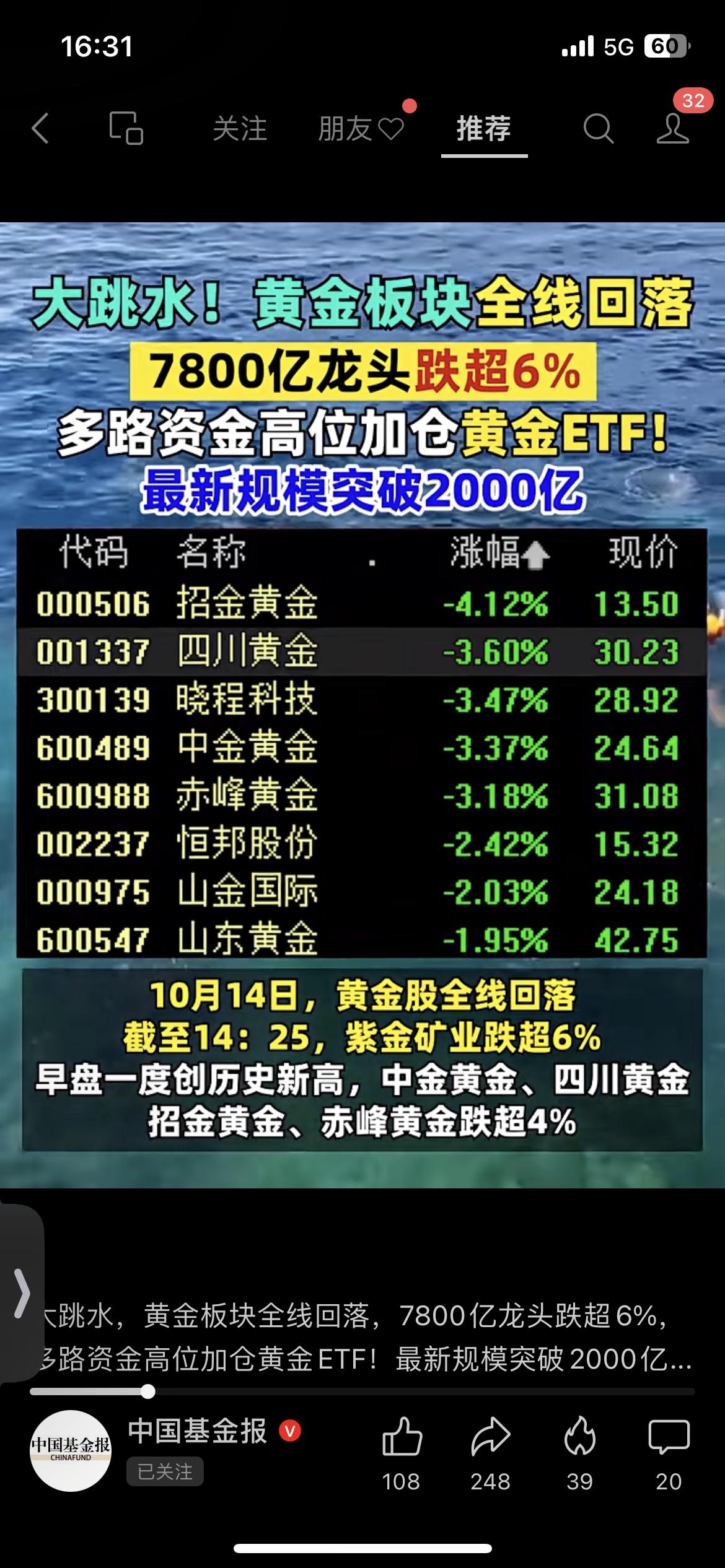 黄金板块大跳水!7800亿龙头跌超6%,资金却狂买黄金ETF,规模破2000亿 10月14日黄金股集体“跳水”,紫金矿业跌超6%,招金黄金、四川黄金等多股跌超4%。 但国际金价却在猛涨!伦敦现货黄金站上4140美元/盎司,COMEX黄金期货冲上4160美元/盎司,续刷历史新高。 更绝的是,资金疯狂加仓黄金ETF!最新规模突破2000亿,年内净流入超745亿。 金价涨、黄金股跌,这波操作你看懂了吗?