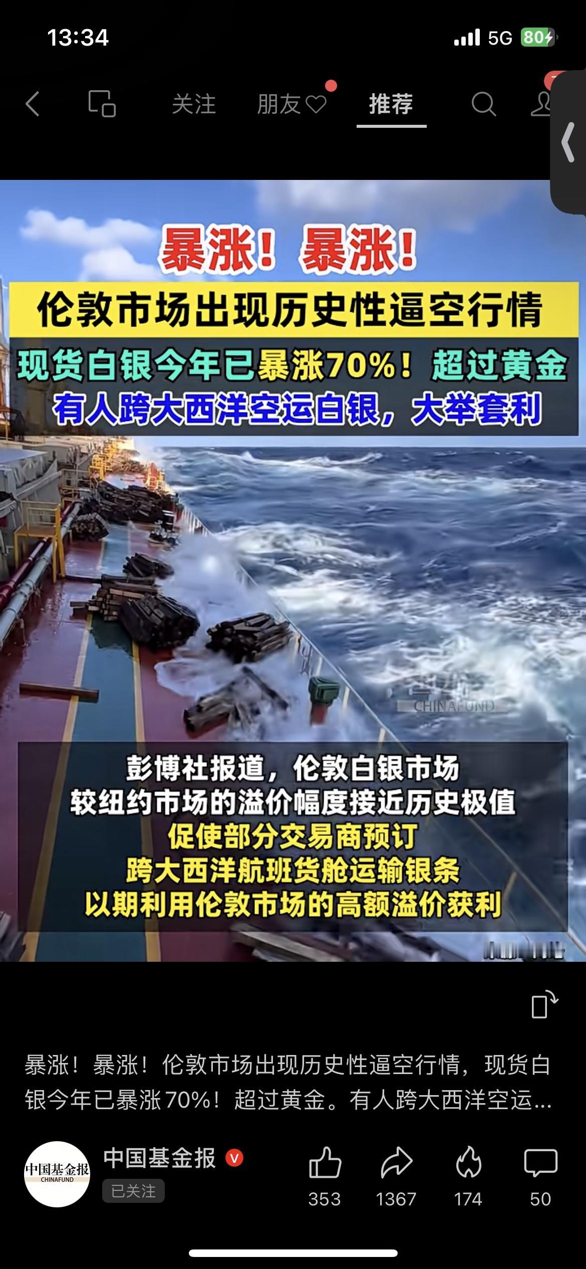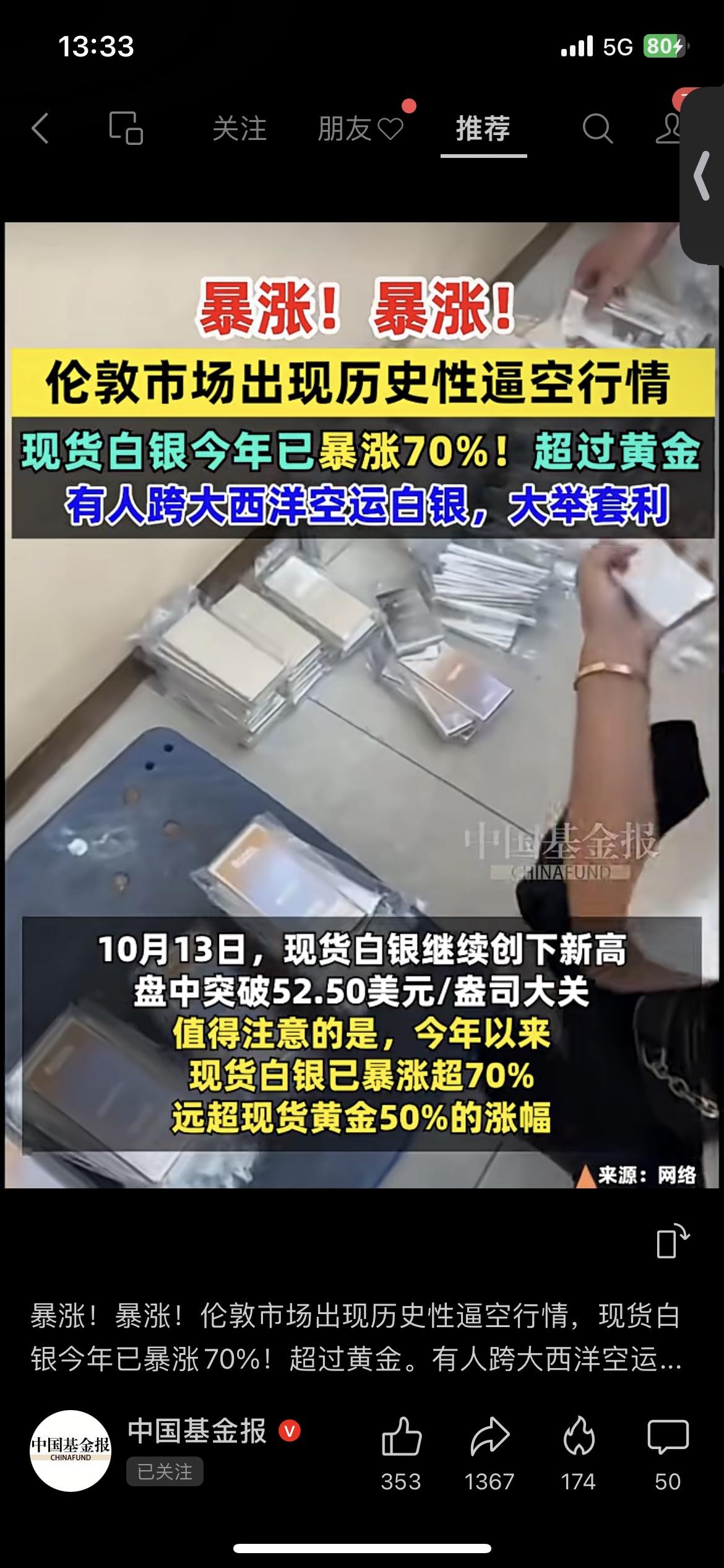 白银疯了!今年暴涨70%碾压黄金,有人跨大西洋空运套利,伦敦市场上演历史性逼空 现货白银彻底火出圈了!10月13日盘中直接冲破52.5美元/盎司,今年以来涨幅超70%,把黄金50%的涨幅远远甩在身后。 更绝的是伦敦市场的历史性逼空行情——因为伦敦和纽约市场的白银溢价快到历史极值了,有人直接包下跨大西洋航班货舱运银条,就为了吃这波套利红利! 这波白银疯涨,你怎么看?黄金白银价格 白银 白银行情