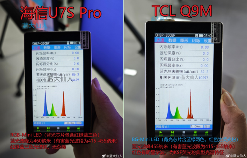 低蓝光的健康护眼更是必须强烈推荐,此前已经有数码博主进行了实测,证实海信U7S Pro(与海信E8S Pro使用同款RGB-Mini LED技术)的RGB三色光谱纯净无杂峰,蓝光波峰精准避开415-455纳米有害波段。而同场检测的另一款RGB产品,不仅蓝光波峰处于有害波段内,红色光谱还有明显杂峰,显然是用的KSF荧光粉。这一轮同台评测,海信RGB-Mini LED电视完胜。 除了这些硬核数据,咱再说点更实用的,比如拥有“深邃黑、超立体”观感的定制黑曜屏Ultra,搭载原生4K 170Hz、最高330Hz动态高刷,配上超顶的0Delay背光同步技术,看科幻大片的极限穿越镜头不拖影,玩4A游戏的混战场景招招到位。为了让高端玩家爽到极致,海信E8S Pro还通过潘通、IMAX双认证,支持一众流媒体的顶级画质技术,帝瓦雷调校的巨浪全屏声场更是让你一秒进入状态,随时开启私人专属娱乐时刻。