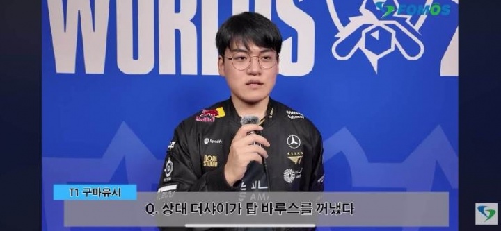Gumayusi:我们一看对面是上单韦鲁斯就决定我去上路跟他打,TheShy选手的上路AD很有名嘛,我很紧张也玩得很有趣,很感谢他用了T1的韦鲁斯冠军皮肤