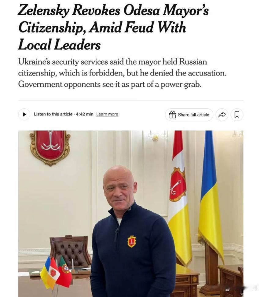 泽连斯基撤销了敖德萨市市长的乌克兰公民身份,指控他拥有俄罗斯国籍 据乌克兰安全部门称,乌克兰总统弗拉基米尔·泽连斯基周二取消了乌克兰第三大城市敖德萨市长的乌克兰国籍,理由是他是俄罗斯公民。乌克兰法律禁止该国公民拥有俄罗斯国籍。 自2014年起就任的敖德萨市长亨纳迪·特鲁哈诺夫在一份声明中否认了自己拥有俄罗斯国籍,并表示将就取消国籍一事向乌克兰最高法院上诉。 多年来,有关特鲁哈诺夫是俄罗斯公民的指控一直流传。特鲁汉诺夫曾是一个现已被取缔的亲俄政党的成员。乌克兰安全部门于2016年表示,他们尚未找到任何证据。乌克兰反腐败部门还指控特鲁汉诺夫挪用公款。 战争期间,特鲁汉诺夫对泽连斯基的批评基本克制。但他反对某些政策,例如重新命名街道和移除与俄罗斯帝国相关的雕像。敖德萨这座城市深受俄罗斯帝国的影响,充满了这样的象征。