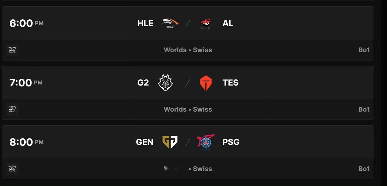 瑞士轮首日对决: 1:00 VKS vs TSW 2:00 CFO vs FNC 3:00 MKOI vs KT 4:00 BLG vs 100T 5:00 FLY vs T1 6:00 HLE vs AL 7:00 G2 vs TES 8:00 GEN vs PSG 看点不是很多,大多数队伍实力差距明显。可能唯一强强对决就是hle和al,g2现在也早已没有当年的实力了,tes大概率还是会过关吧! 英雄联盟[超话]
