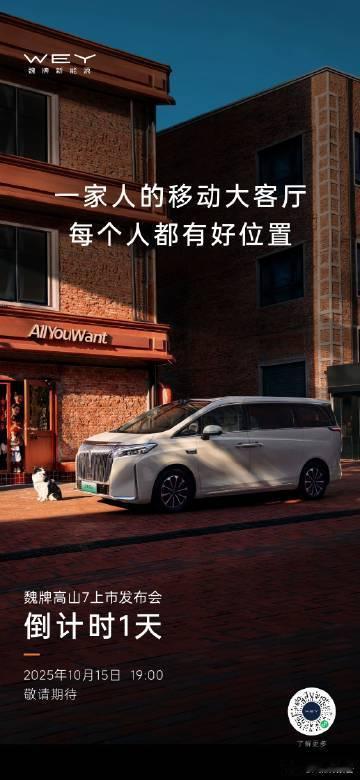10月14日,长城汽车发布,一家人的移动大客厅,每个人都有好位置,魏牌高山7上市发布会将于10月15日19:00正式开始,敬请期待!