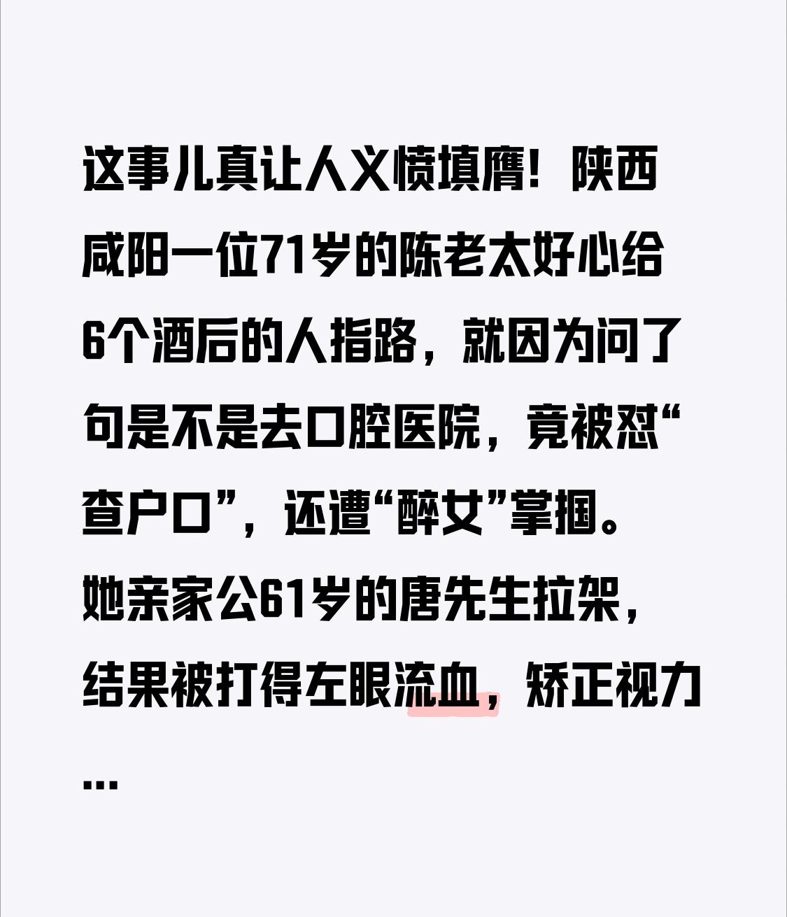 这事儿真让人义愤填膺!陕西咸阳一位71岁的陈老太好心给6个酒后的人指路,就因为问了句是不是去口腔医院,竟被怼“查户口”,还遭“醉女”掌掴。她亲家公61岁的唐先生拉架,结果被打得左眼流血,矫正视力降至0.3。 陈老太本是一番好意,却换来这样的遭遇。女店主唐女士希望警方追究他们的法律责任,确实应该!酒后也不能这么撒野啊,任意伤人必须付出代价。目前咸阳警方已立案调查,希望能尽快给出公正结果,让善良不被伤害,让作恶者受到应有的惩处。