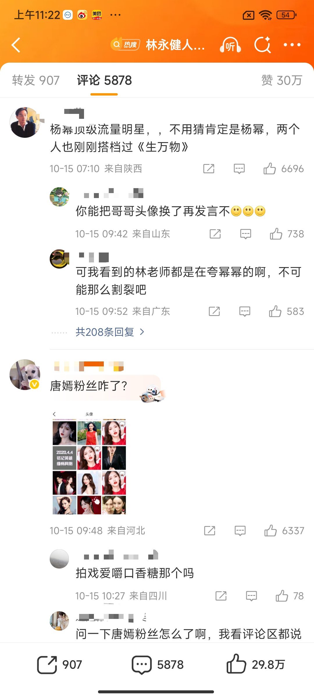 林永健说合作的某顶流片场耍大牌,唐嫣粉丝说是他合作的杨幂,俩人都出演了《生万物》,杨幂粉丝说是唐嫣,因为她迟到一个月不进组[允悲]你们觉得是谁