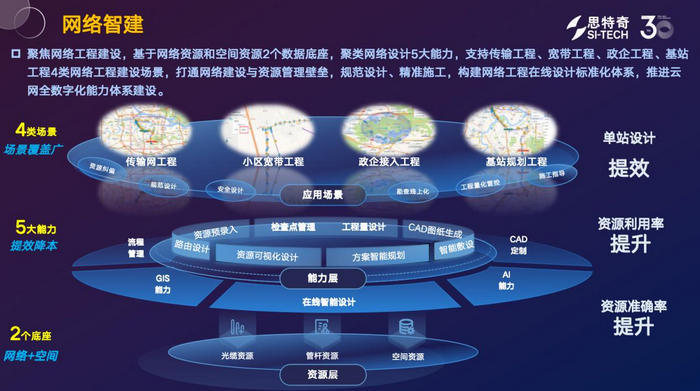 当前运营商网络工程建设领域,“资源数据割裂、设计标准不统一、施工精准度不足”等问题突出。传输、宽带、政企、基站四大类工程场景需求各异,传统设计依赖人工勘察,不仅耗时耗力,还易因数据误差导致资源错配,严重影响网络建设质量与后续运维效率。针对这一行业痛点,思特奇网络智建解决方案以物理资源与空间资源为双数据底座,聚类网络设计五大核心能力,构建全流程自动化管控体系,为四类工程场景提供标准化、智能化支撑。