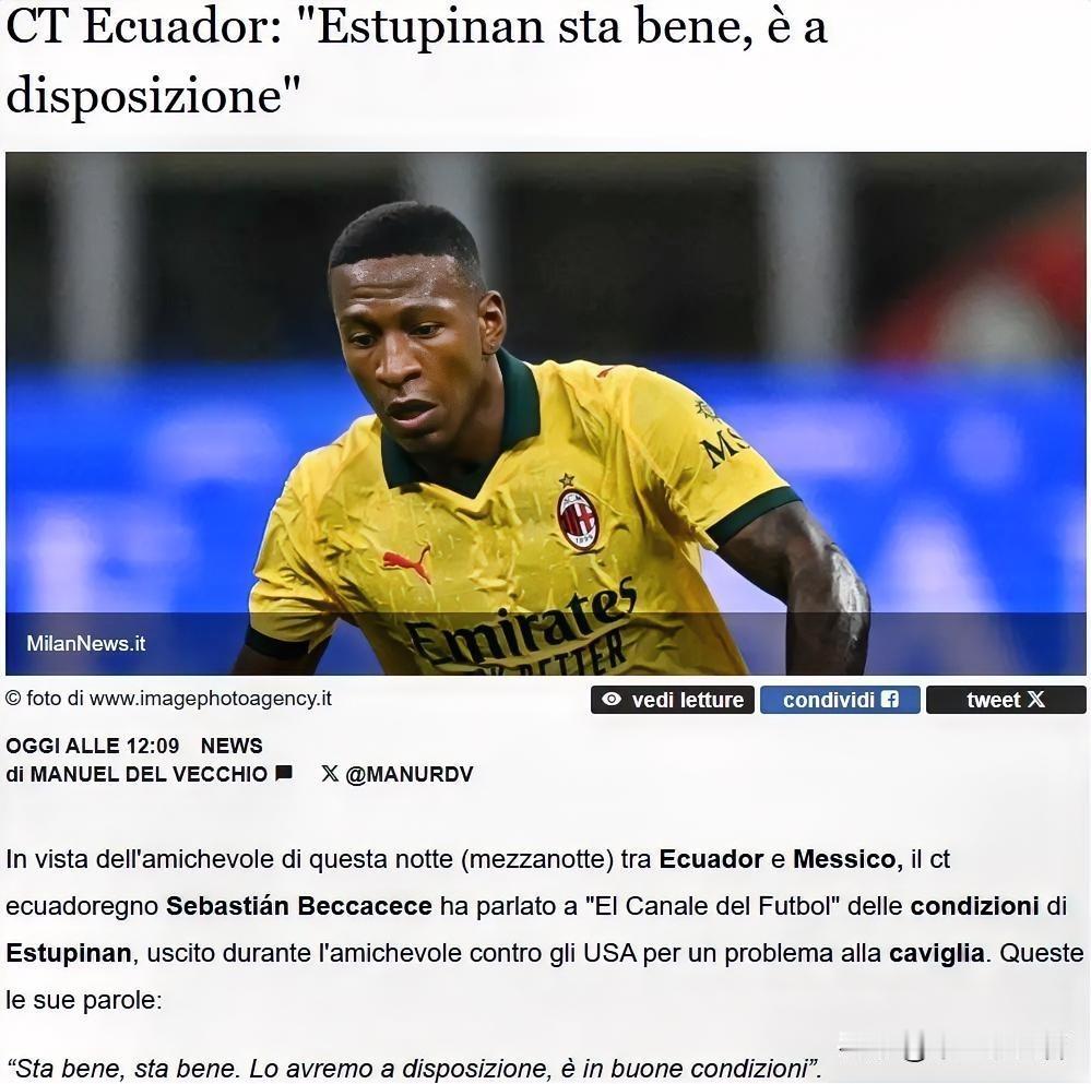 可以吸取教训吗!厄瓜多尔主教练贝卡切斯确认米兰左后卫埃斯图皮尼安已经伤愈,他将以主力身份出战厄瓜多尔与墨西哥的友谊赛。请厄瓜多尔主教练吸取美国国家队经验教训,美国国家队队长普利西奇同样是脚踝问题,同样是主教练说身体无碍,同样说可以出场,然后普利西奇受伤了,埃斯图皮尼安同样是厄瓜多尔队长,咱们能不冒险吗,米兰主力阵容快伤没了。 埃斯图皮尼安在厄瓜多尔之前对阵美国的友谊赛中遭遇了脚踝问题,在半场休息的时候就被换下。埃斯图皮尼安现在状况很好,真的很好。我们可以让他上场,他现在的身体状况良好。这个事情上米兰俱乐部有问题,俱乐部应该和球员教练沟通下,友谊赛就别上了,一场友谊赛意义真的如此重大吗?埃斯图皮尼安又不是啥超级球星,需要他来拉动票房,埃斯图皮尼安的上场真的那么有必要吗。 看到普利西奇受伤个人觉得波切蒂诺就是报复之前普利西奇拒绝参加金杯赛,明明脚踝有问题,非要让普利西奇上,同样的道理埃斯图皮尼安脚踝有问题,厄瓜多尔还是一场友谊赛,这样的出场真的有必要吗。