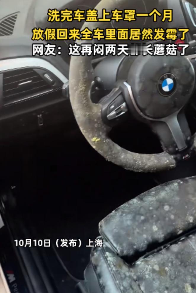 这下后悔了吧!10月10日,上海,一男子在放假之前洗了车,随后为了防止车子被太阳暴晒,竟直接给车罩上了一层防晒,结果放完假期回来之后,男子惊讶的发现自己的车子里都发霉了!网友:再过两天都开始长蘑菇了。   10月10日,安徽六安的朱先生刚结束一个月的假期回家,准备重新启用爱车,当他打开车门,一股刺鼻的霉味扑面而来,眼前的一幕让他目瞪口呆:车内的真皮座椅、方向盘、车门内衬,几乎布满了密密麻麻的霉斑,有些地方甚至出现了青绿色的霉层。   朱先生赶紧回忆,原来放假前他特意洗了车,为了防止灰尘和阳光直射,还细心地给车罩上了车罩,可他没等车内完全晾干,就匆忙离开了,这一个月里,家乡持续阴雨,空气湿度极大,车罩把湿气全锁在车里,等于给霉菌造了一个完美的“培养皿”。   朱先生无奈之下,把车送到专业洗车店处理,清洗人员表示,这种情况并不少见,清理难度极大,真皮座椅上的霉斑必须用专业清洁剂反复擦拭,还要喷洒除霉剂,再进行彻底烘干,如果处理不当,皮质容易受损,霉斑还会反复,整个清理过程不仅耗时,费用也不低,更麻烦的是,霉菌孢子可能残存在空调系统和座椅缝隙里,影响车内空气质量,甚至对健康造成隐患。   类似事件在梅雨季节和长假后频繁发生,上海、杭州等地都出现过车主因长期停放、车罩密闭导致车内发霉的案例,有车主自嘲:“这车怕是要载入史册了!”也有网友调侃:“真皮才会发霉,再过两天都开始长蘑菇了!”   视频发布后网友直言:“这是大自然的涂鸦!”也有人感叹:“车太脏了,所以才霉菌多,”这些调侃背后,是对用车常识的反思,很多车主以为车罩能全方位保护爱车,却忽略了通风的重要性。   要避免类似悲剧,其实并不难,洗车后,一定要确保车内完全干燥,包括座椅、脚垫、空调系统等,长期停放时,尽量选择干燥通风的环境,或者使用透气性好的车衣,在车内放置干燥剂、竹炭包,也能有效吸湿,定期启动车辆,打开车窗通风,更是简单有效的防潮方法[微笑]。   对于梅雨天气汽车防潮,你有什么方法呢? --------------------------------