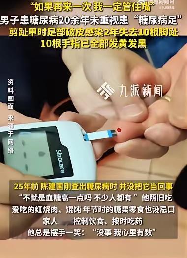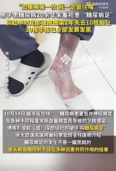 这篇报道生动反映了糖尿病足的严重后果和预防的重要性。以下是我的总结与建议: 糖尿病足的危害: 糖尿病患者因为血糖控制不佳,容易发生足部溃疡、感染,甚至需要截肢。陈先生的案例显示,轻微的小伤口若未及时处理,可能导致严重感染和多次手术,最终失去十个脚趾,甚至完全坐轮椅。 原因分析: 血糖控制不良:高血糖提供细菌繁殖环境,血液循环差影响伤口愈合。 神经病变:脚部感觉迟钝,容易忽略伤害。 局部血液循环差:导致伤口难愈合、感染扩散。 预防措施: **控制血糖:**按医嘱服药,规律监测血糖,健康饮食,避免高糖高脂食物。 **注意足部护理:**每天用温水洗脚,保持干燥,修剪脚趾甲不要太短或剪伤皮肤。 **穿合适的鞋袜:**宽松透气鞋子,纯棉袜子,避免挤压和摩擦。 **定期检查:**每天观察脚部,留意红肿、水疱、破皮、变色等异常。一旦发现问题,立即就医。 **避免烫伤:**脚部感觉迟钝,勿用热水袋或电热毯直接加热。 家庭与社会责任: 家人应协助糖尿病患者进行足部检查和日常护理,早期干预能有效减少截肢风险。医生和媒体提醒我们,预防比治疗更重要。 心理疏导: 患者需树立正确的健康观念,按时用药、管理血糖,避免侥幸心理,减少因疏忽带来的严重后果。 综合建议: 定期体检,保持血糖稳定。 关注足部健康,落实日常护理。 家人陪护和督促,意识到糖尿病足的危害性。 遇到任何异常立即就医,不要掉以轻心。 关于疑问或讨论: 如果你有关于糖尿病足的具体护理方法、最新的治疗进展,或如何科学管理糖尿病的建议,欢迎继续提问!糖尿病 糖尿病病人