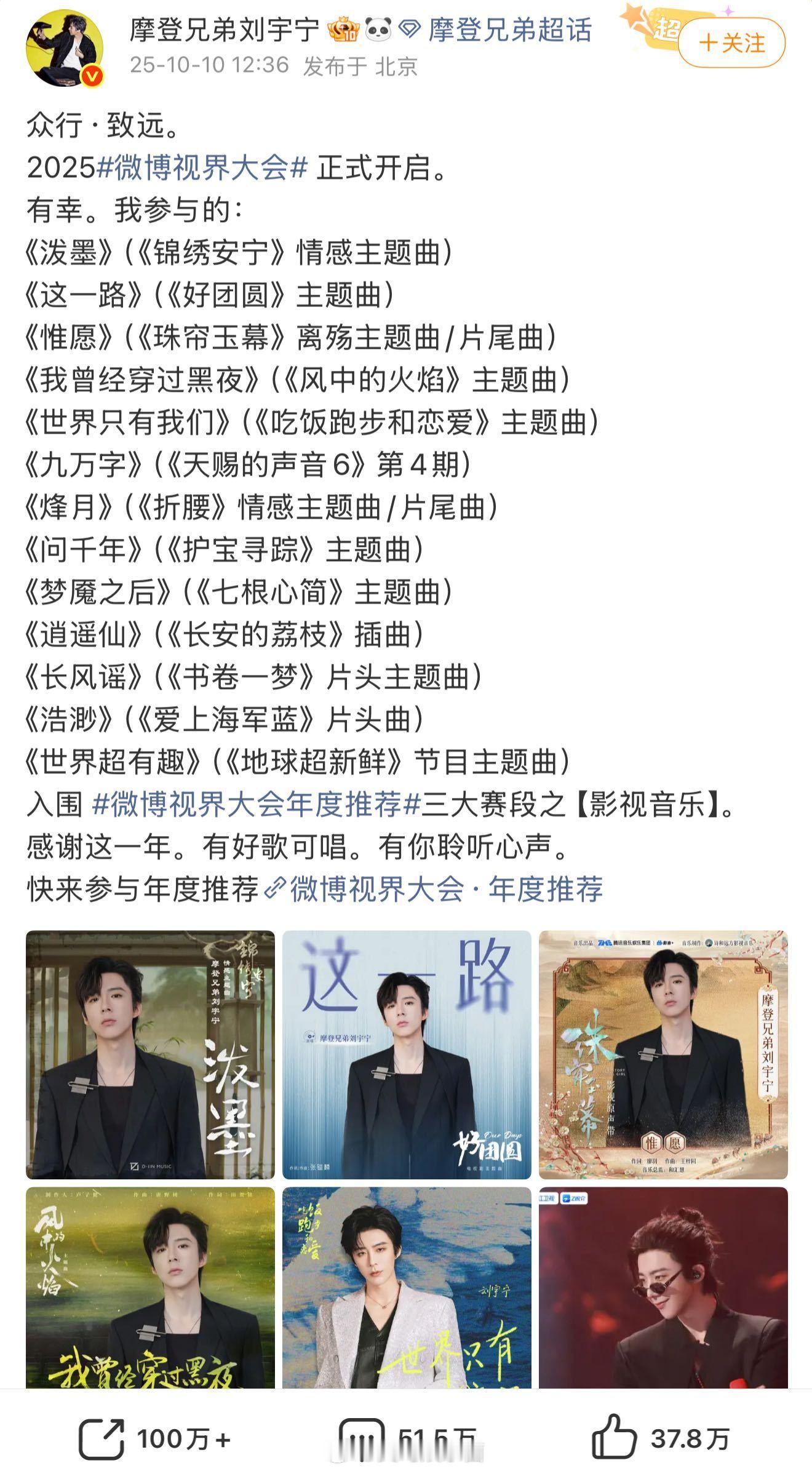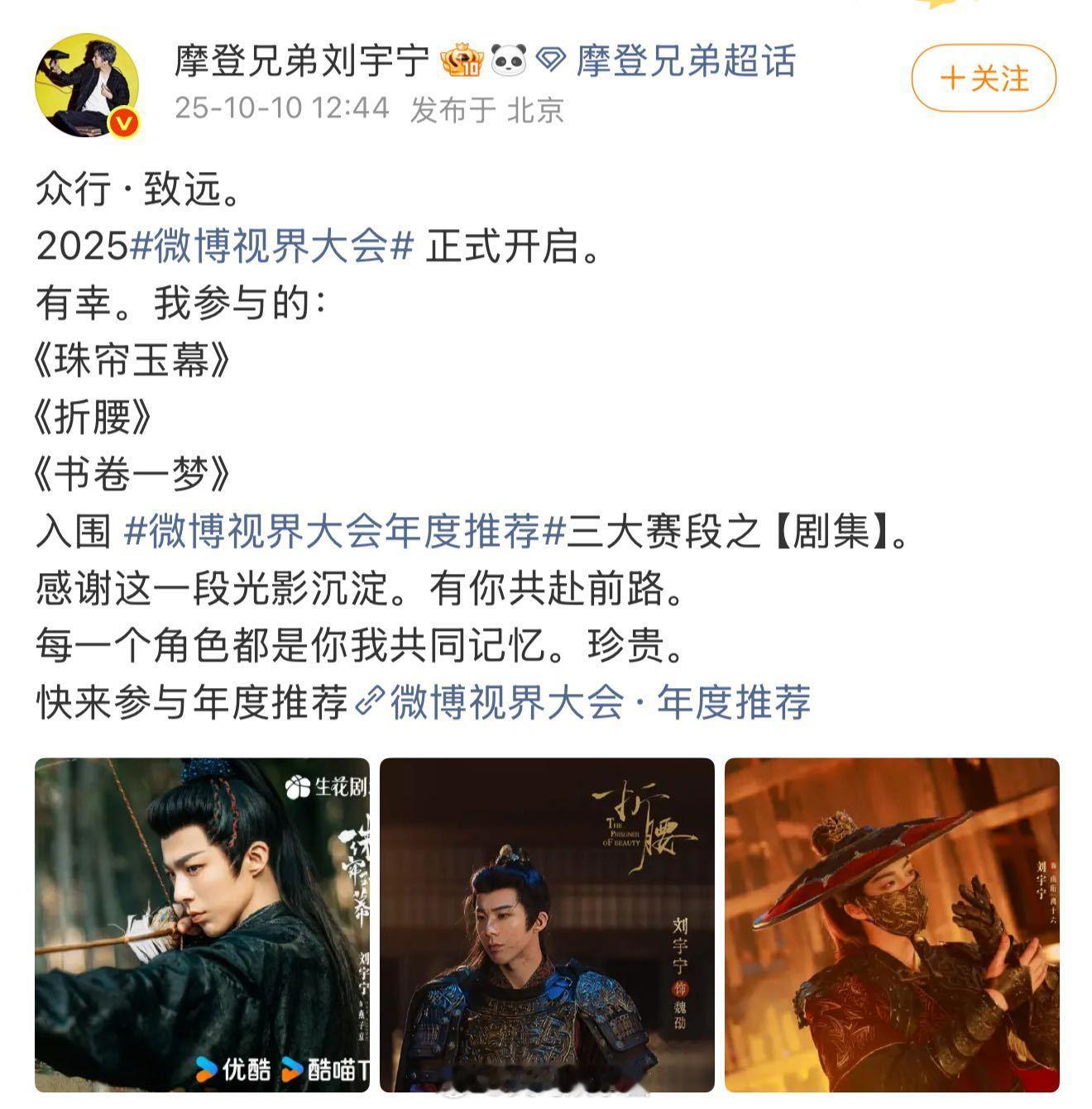 刘宇宁今年简直全面开挂了,今天唯一一个首发官宣!更别提“刘宇宁的”演唱会巡演场场爆满,电视剧好几部热度破万,根本停不下来!接下去3部待播剧《天地间心》、《暗河传》、《水龙吟》的ost,还全部有刘宇宁的献唱!真就这个刘宇宁爽!这事业运能不能分我一半啊[柯基] 1111惊喜之夜