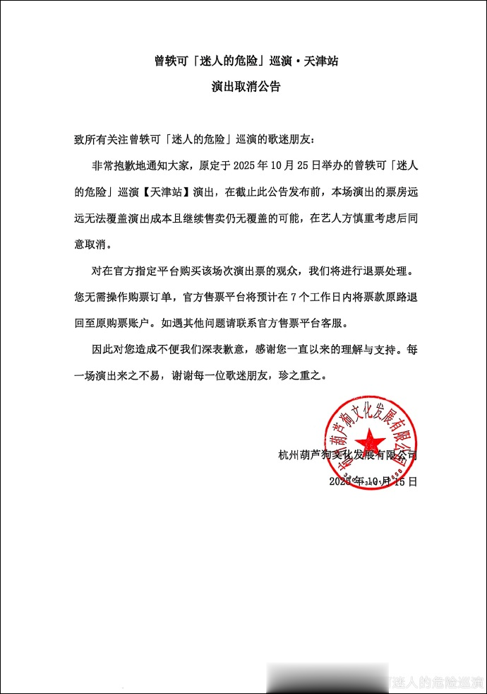 非常抱歉地通知大家,原定于2025年10月25日举办的曾轶可迷人的危险巡演天津站演出,在截止此公告发布前,本场演出的票房远远无法覆盖演出成本且继续售卖仍无覆盖的可能,在艺人方慎重考虑后同意取消。