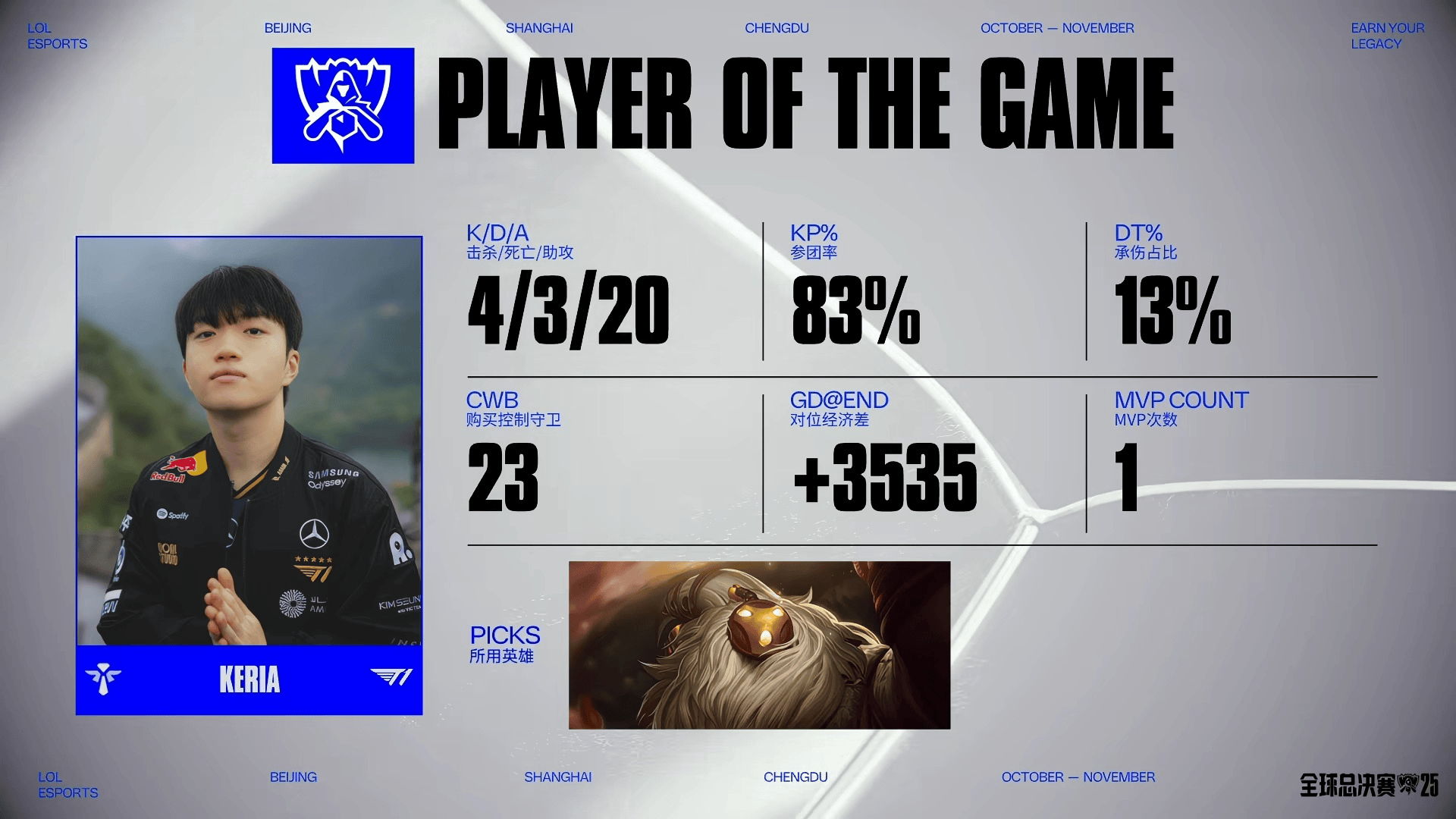 Keria巴德砍下4/3/20的战绩,拿下T1对阵FLY首局MVP