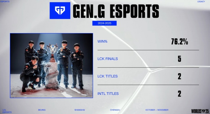直播吧10月15日讯S15瑞士轮GEN对阵PSG赛前,官方直播间放出了GEN成绩图,但是选手合照放的是S14T1合照。
