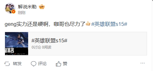 直播吧10月15日讯S15瑞士轮PSG不敌GEN,赛后解说米勒更博锐评:geng实力还是硬啊,咖哥也尽力了。