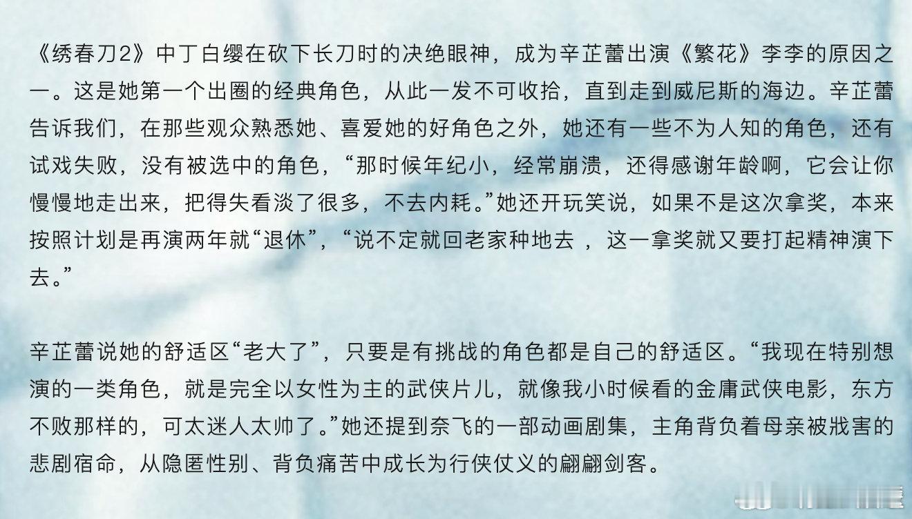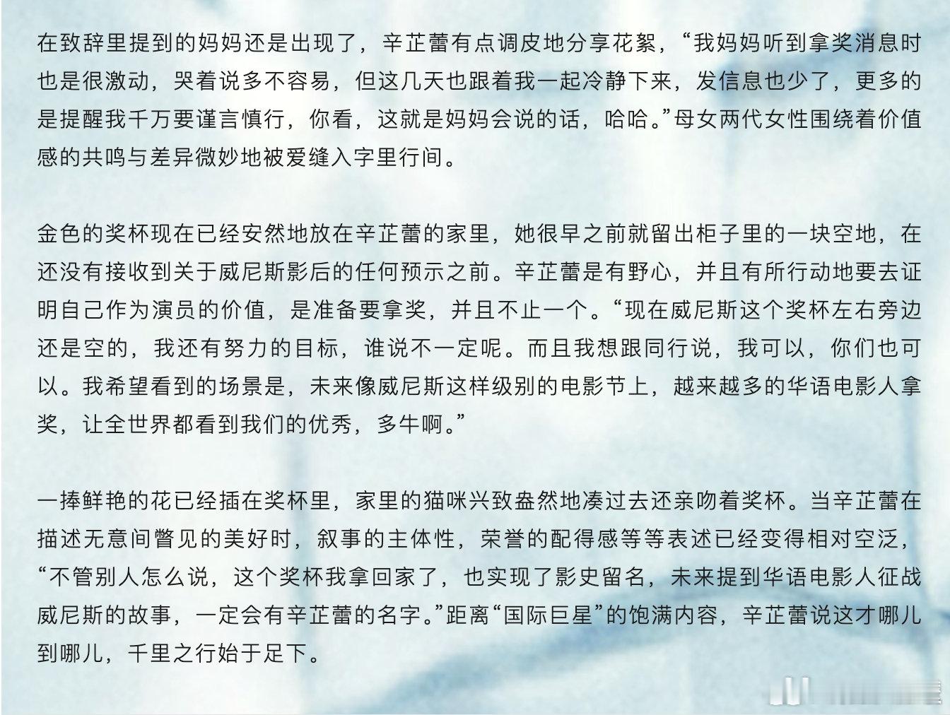 同时,辛芷蕾还分享了与母亲的互动,她提到妈妈听到自己拿奖消息时很激动,哭着感慨不易,但之后也冷静下来,更多提醒她要谨言慎行。辛芷蕾还笑称若不是此次获奖,本打算再演两年就 “退休”,回老家种地,而现在拿奖后又要打起精神继续演下去。