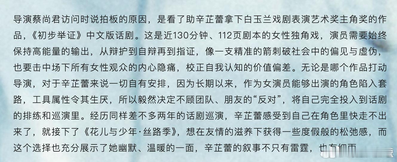 辛芷蕾妈妈让她谨言慎行辛芷蕾曾因厌恶女演员角色套路去尝试话剧 近日,接受采访,分享了自己的演艺经历与内心想法,透露长期以来,作为女演员能出演的角色陷入套路,工具属性令她生厌,于是她不顾团队、朋友 “反对”,毅然将自己完全投入到话剧《初步举证》中文版的排练和巡演中。