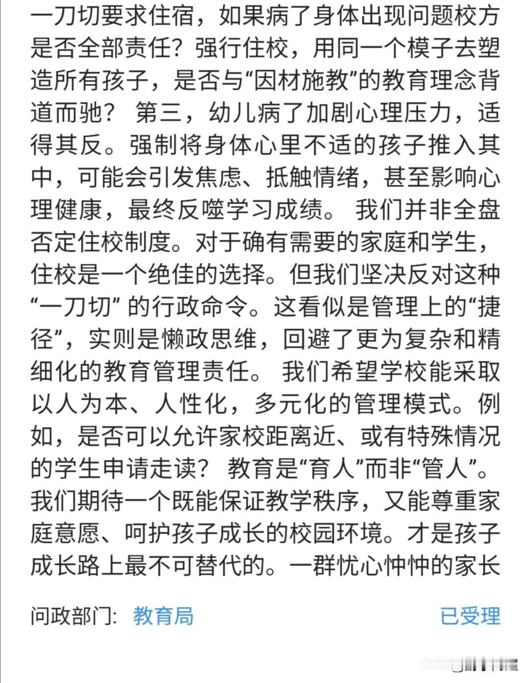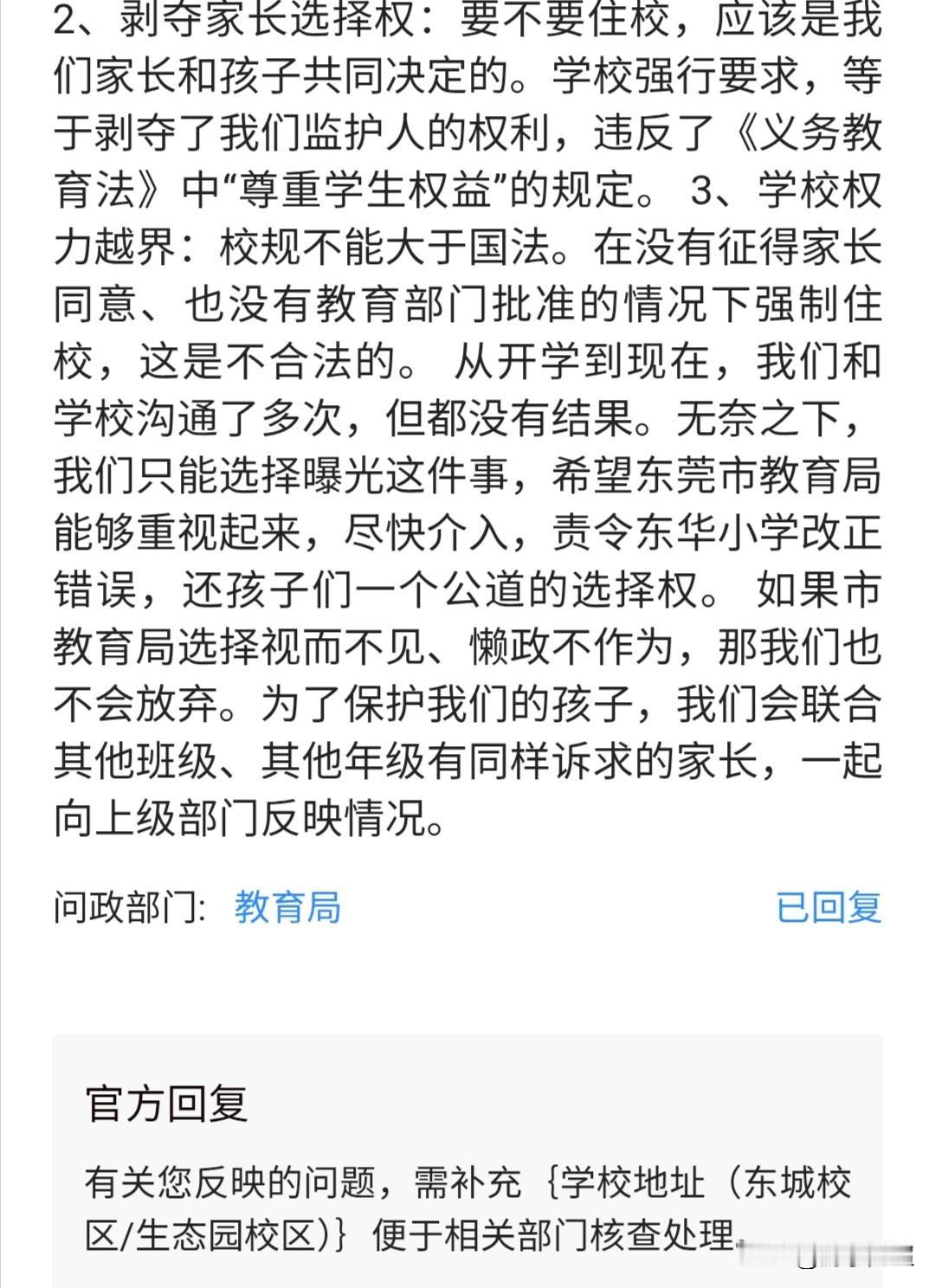 近日,有家长在问政平台投诉东莞市东华小学强制学生全部住校,目前官方已受理并调查相关情况。 东莞市东华学校为民办学校,为便于统一管理,建校几十年来,该校从幼儿园到高中一直实行寄宿制。 部分家长将孩子送入东华,正是看中了这种教育管理模式,认为其能从小培养孩子独立自主的学习和生活能力。但也有家长觉得孩子年纪尚小,还离不开父母的陪伴。 在东莞,多数民办学校都是采用统一住宿管理模式,而公办学校学生则可自由选择住宿或走读。