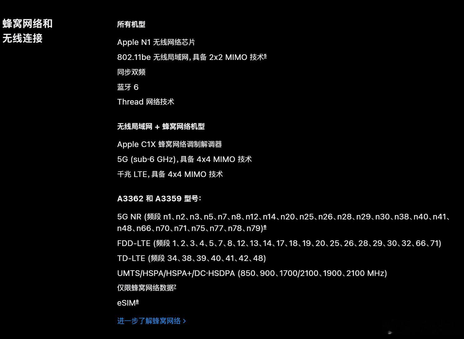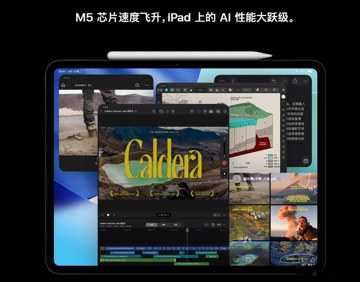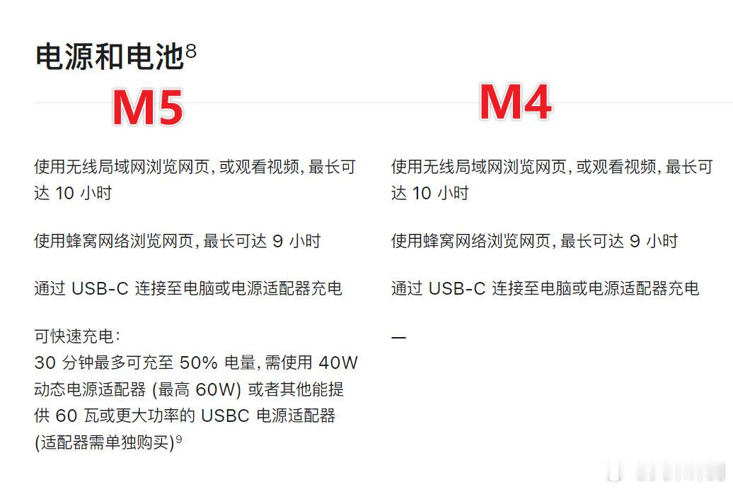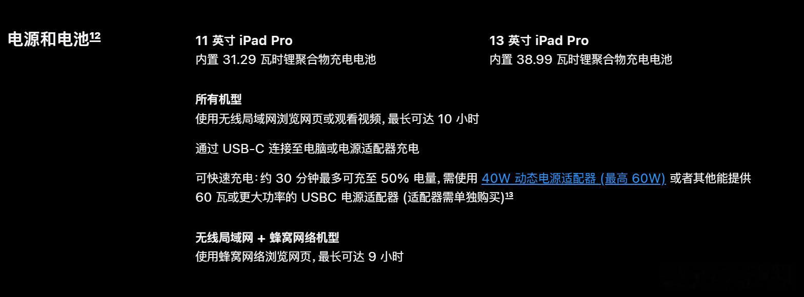 其中1TB和2TB存储版本,搭载的是10核CPU(4+6),内存容量是16GB。不过除了处理器,其它方面的规格好像和之前M4 iPad Pro差别不大(充电速度也有提升,30分钟50%,建议60W或更大功率电源适配器)。所有机型搭载苹果的N1无线网络芯片,支持蓝牙6和Wifi7,另外蜂窝网络版,搭载的是C1X基带。
