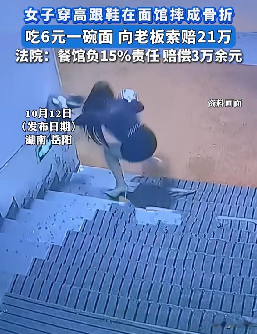 女子穿着高跟鞋在面馆摔伤,最后关于赔偿的问题打起了官司。 10月12日,湖南岳阳