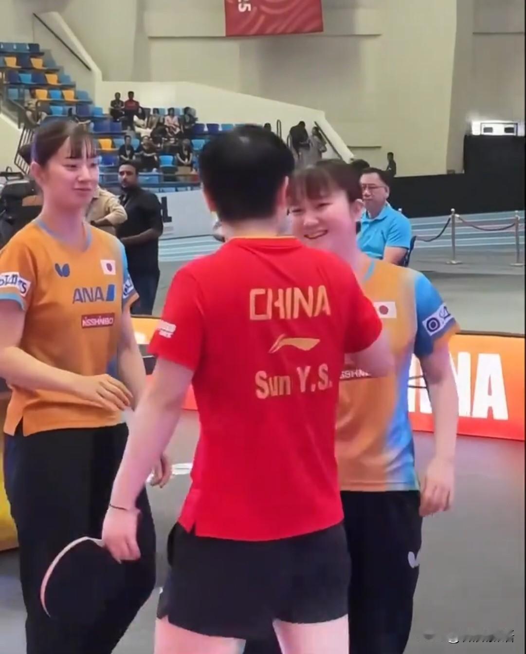 大藤沙月也很喜欢莎莎啊。 今晚女团决赛中国队3-0战胜日本队,赛后双打运动员握手,大藤沙月和莎莎握手,俩人还顺便掰个手腕,大藤沙月看到莎莎就很开心,这是真的打服了,记得上次有个采访,问大藤沙月的偶像说谁,她说是孙颖莎。赛场上是对手,赛场下也是很好的朋友,看到每次出去打比赛,在训练馆的时候大藤沙月也会跟莎莎打招呼,然后聊几句。 今年我们中国女队把冠军拿回来了,去年马琳没有站上领奖台,今年邱贻可带着女队拿到亚锦赛冠军了,他可以和女队一起站上领奖台。就是印度这个颁奖仪式有点慢,刚刚看到还在开音乐会,不知道几点可以颁奖,奖杯还在那里等着运动员们拿呢。 这次印度之行,虽然环境不是很好,但是我们的运动员都坚持下来了,特别是昨晚男团半决赛,让大家看到了男队的团魂,中国乒乓球队还是那个乒乓球队,恭喜中国队拿到亚锦赛男团、女团冠军,明天就可以回国了,回来后好好休息,大家都辛苦了!