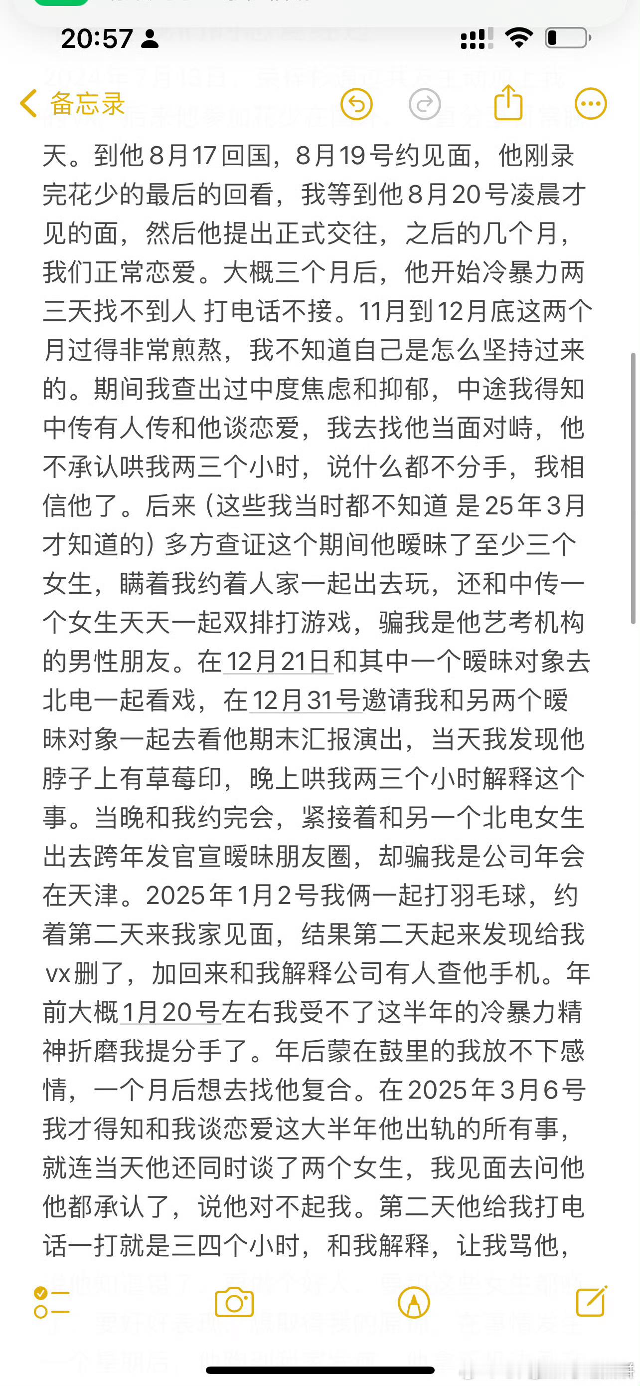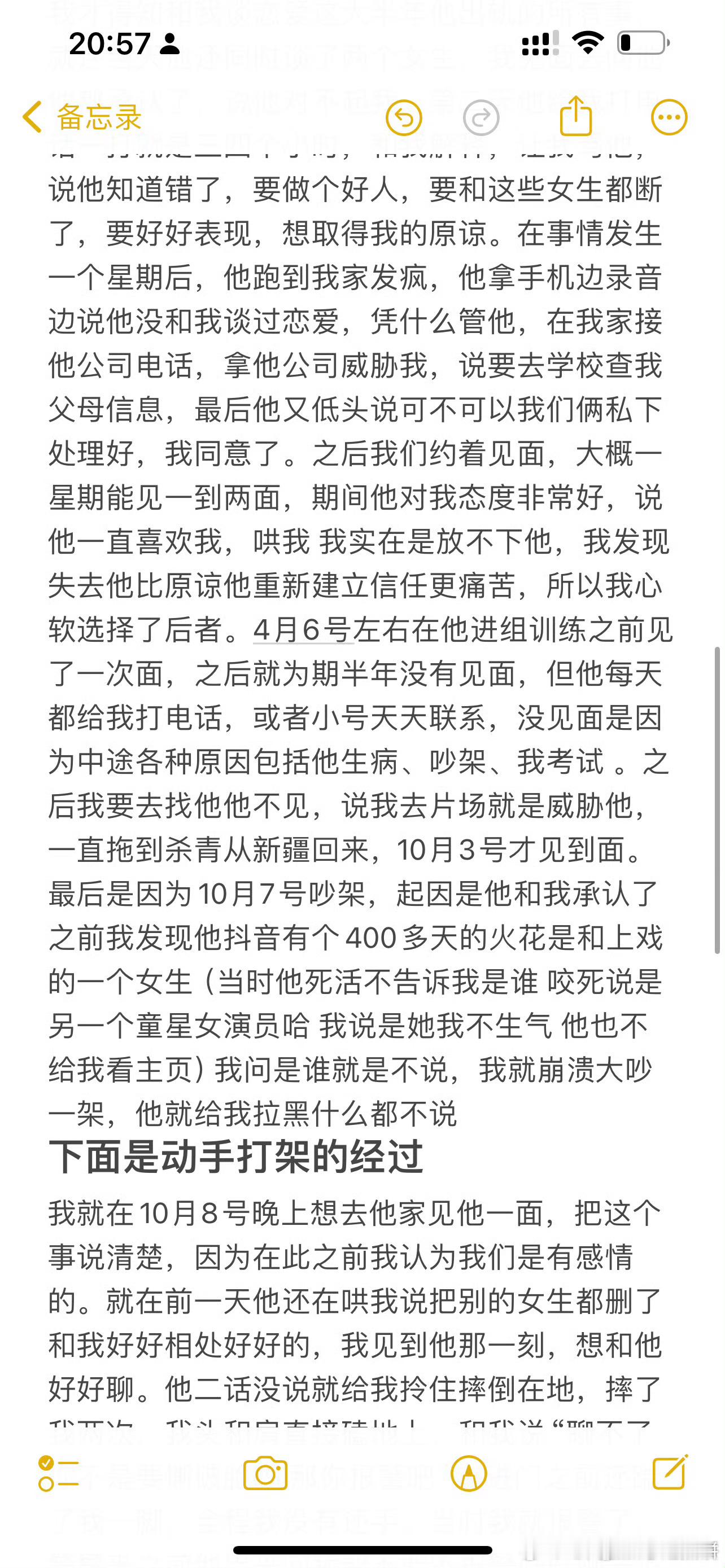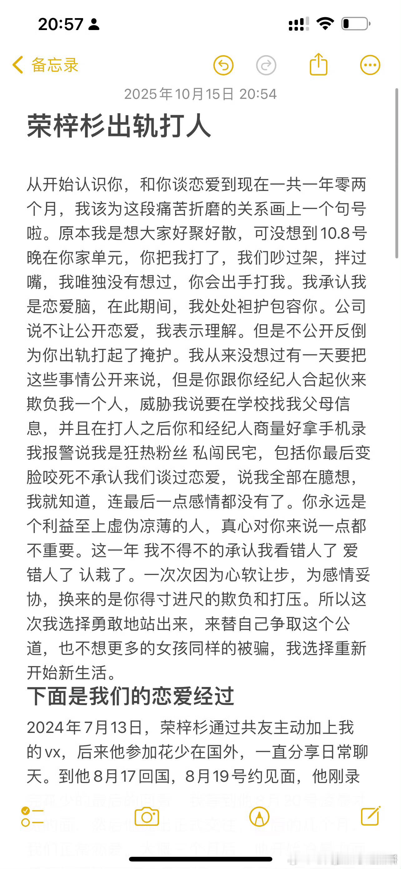 有女演员李禹熹发微博长文控诉荣梓杉,文中称荣梓杉在两人恋爱期间出轨打人,还公开了