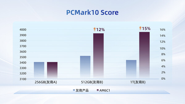 在PCMark10测试中,AM6C1的512GB与1TB版本得分均突破3900,较友商B同类产品领先10%以上;其256GB版本的表现亦与友商A的同级产品相当。