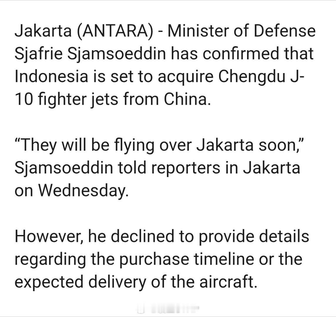 印尼安塔拉通讯社报道,印尼国防部长沙夫里对记者表示,印尼将采购中国歼-10战斗机。不过,他拒绝透露有关采购的具体时间表或数量等细节。