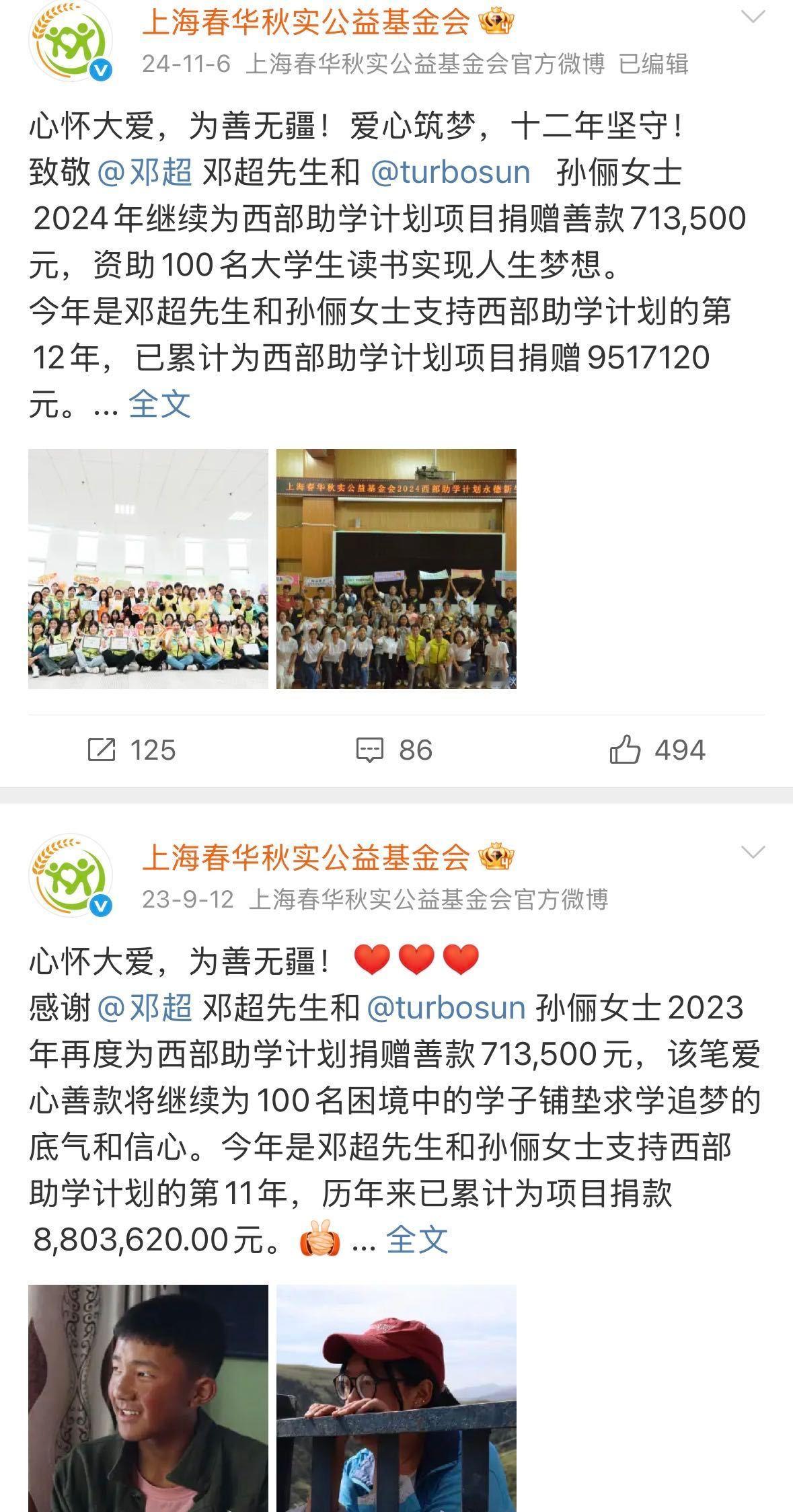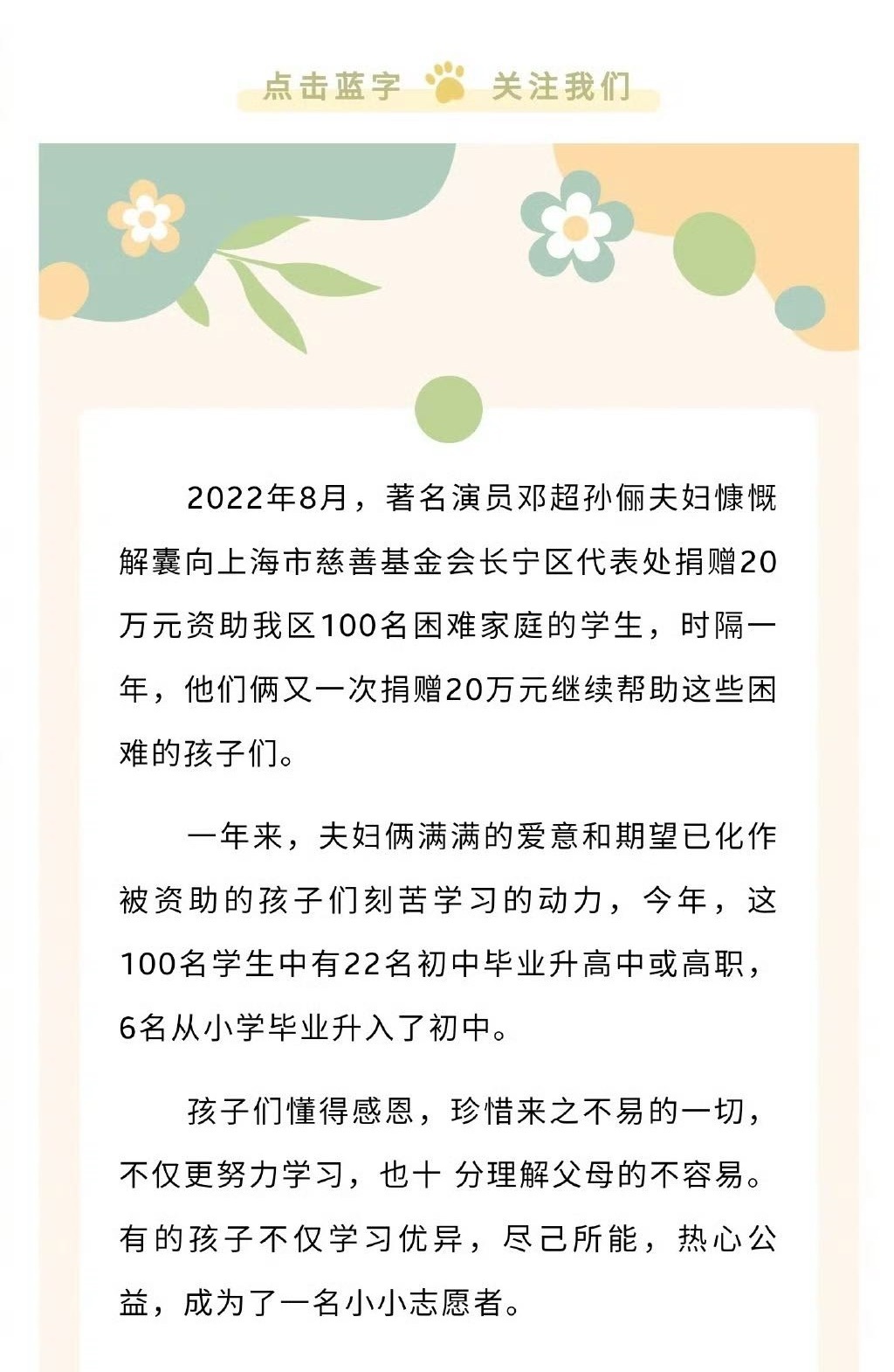 孙俪常年救助流浪猫狗,定期捐赠狗粮猫粮,给毛孩子一个温暖的家;邓超每年回南昌都不忘看望藕奶奶,用最朴素的方式照顾一份小本生意。