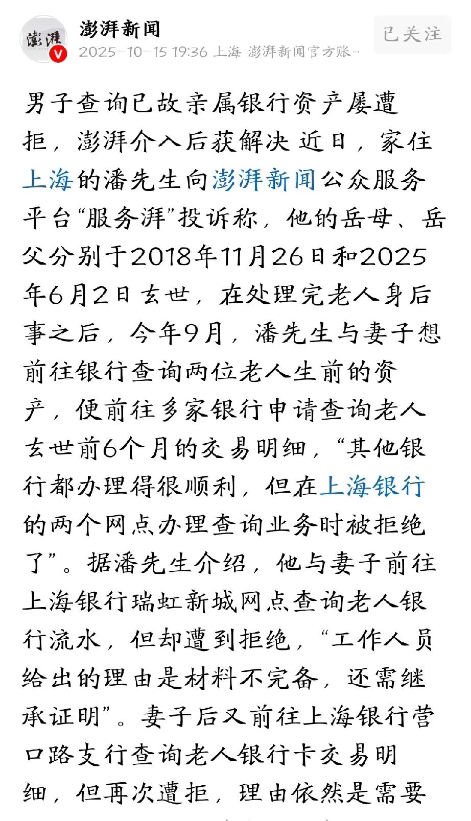 上海,男子岳父岳母去世后,他和妻子拿着相关材料到银行查询老两口卡上的流水,谁知,竟遭到工作人员果断拒绝,一口咬定他们材料不全,要他们再去准备各种材料。男子一连跑了好几趟,却都被以各种理由拒绝,他非常气愤,因为来之前他专门查过相关政策,并没有这么繁琐的规定,怎么一到银行,就各种刁难。于是,他只能向媒体求助,没想到,媒体介入后,银行的态度发生了颠覆性的转变。 最近,潘先生遇到了一件烦心事。 他的岳母和岳父分别在2018年底和2025年夏天去世,处理完两位老人的后事,他和妻子开始整理老人身前的财务情况。 因为老人名下有好几张卡,今年9月,他两拿着相关材料,陆续去了多家银行,申请查询老人去世前六个月的账户流水。 让他没想到的是,在其他银行都办得挺顺利,唯独在上海银行碰了钉子。 潘先生和妻子来到上海银行某网店,工作人员得知来意后,直接拒绝了查询申请。理由是,他们二人准备的材料不全,需要提供继承证明。 潘先生很纳闷,妻子明明是岳父岳母的第一顺序继承人,该带的证件全都带齐,其他银行都行,怎么到这儿就不行了呢? 但工作人员一口要定不行,两人只好先行离开。 过了几天,潘先生的妻子不甘心,又独自来到其他支行,结果还是一样被拒绝了,理由都如出一辙。 她想不通,自己证件齐全,为何不行,她怀疑是故意刁难。 但工作人员强调,这是他们银行的内部规定,要是不服气,可以去仲裁,或者走去诉讼程序。 这话让潘先生夫妻特别气愤,们只是想查个流水,怎么就闹到要打官司的地步。 潘先生仔细研究了相关政策,发现2024年6月1日实施的《国家金融监督管理总局 中国人民银行关于优化已故存款人小额存款提取有关要求的通知》第四条的规定: 已故存款人的第一顺序继承人,基于合法、正当理由,有权要求银行提供已故存款人死亡后以及死亡前6个月内的账户交易明细。 妻子作为其岳父岳母的第一顺序继承人,且是基于整理老人身前财务情况的合法、正当理由申请查询,是符合该通知要求的,银行应当予以配合。 明明是国家出台的便民政策,怎么到了银行,就不能执行不了呢? 更让他郁闷的是,银行工作人员还提出必须取款时才能查询、无卡折不能办等附加条件,这些都在规定里找不到依据。 为了这事,夫妻俩前前后后跑了好几天,不仅耽误工作,还搭进去不少交通费,虽然钱不多,但潘先生觉得这事儿不能就这么算了。 他要求:一是希望银行能认真执行国家政策,别让好规定成了空文;二是希望相关责任人能赔礼道歉,并补偿他们这些天来回奔波的费用,算下来大概200元。 10月初,他将此事反映给了媒体,没想到,媒体介入后,转机很快就来了。 10月13日,潘先生接到了上海银行某网点的电话,请他过去办理查询业务,而且这次工作人员的态度明显不同,很顺利地就帮他们办完了手续。 目前,双方已经达成一致,但潘先生希望,银行以后能多为客户着想,别让普通人办个简单业务都这么难。 想不通,银行为什么要把把简单的事情复杂化,国家明明出了便民的好政策,银行这儿,却还要群众多跑腿、多开证明。 从法律角度来看,上海银行最初拒绝潘先生及其妻子查询已故存款人账户流水的行为是不符合规定的。 根据2024年6月1日实施的《国家金融监督管理总局 中国人民银行关于优化已故存款人小额存款提取有关要求的通知》第四条规定:已故存款人的第一顺序继承人,基于合法、正当理由,有权要求银行提供已故存款人死亡后以及死亡前6个月内的账户交易明细。 潘先生妻子作为老人的第一顺序继承人,查询老人银行流水属于正当理由,银行应该配合。 银行以需要提供继承证明等理由拒绝,与上述规定不符。 虽然银行有义务为存款人保密,但在第一顺序继承人基于合法正当理由申请查询的情况下,应当按照规定提供相关交易明细。 同时,银行提出的“必须取款时才能查询”“无卡折不能办”等附加条件,在相关规定中也找不到依据,属于额外增加继承人的负担。 此外,《民法典》规定:继承人有权继承被继承人与银行之间储蓄存款合同项下的权利义务。 在继承人具备合法身份和正当理由的前提下,银行拒绝提供账户交易明细,可能构成对继承人合法权益的侵犯。 好在媒体介入后,银行顺利为潘先生办理了查询业务。 银行服务不该这么死板,要多替客户想想,主动帮解决问题,而不是拿着条条框框为难人,大家办事该多舒心。