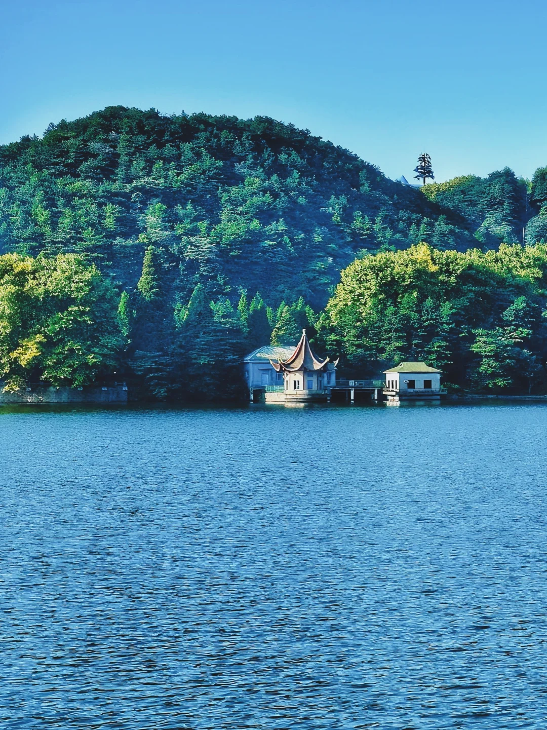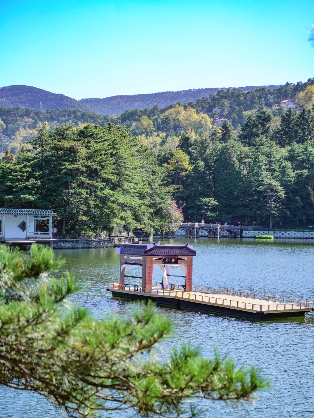 湖形似琴,秋日枫叶环湖,色彩斑斓如调色盘。