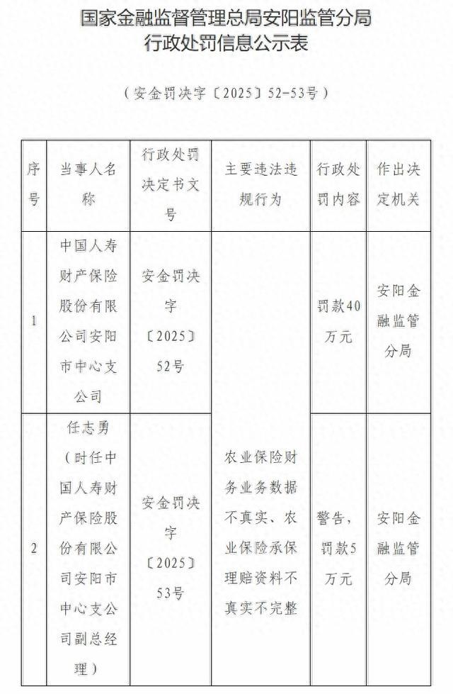 信网10月16日讯近日,中国人寿财产保险股份有限公司安阳市中心支公司因农业保险业务数据不真实等问题,被安阳金融监管分局处以40万元罚款。时任副总经理任志勇也因相关责任受到警告并罚款5万元。