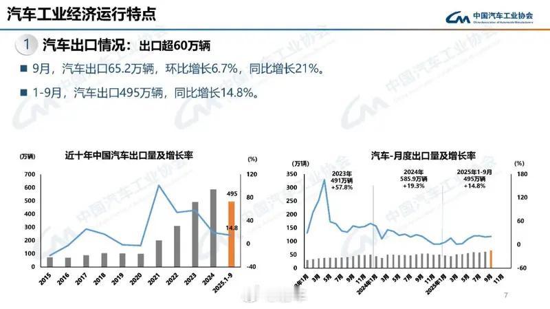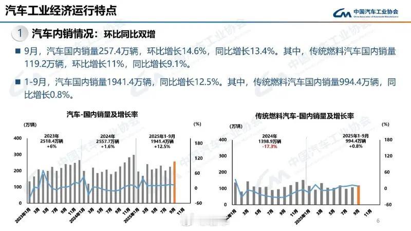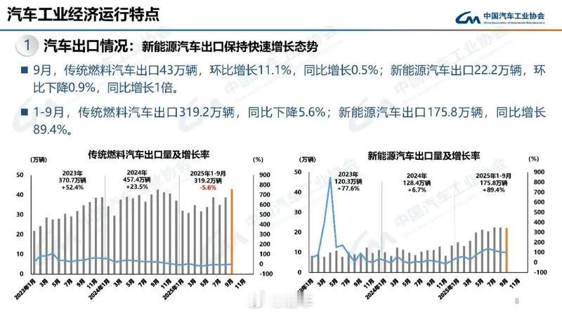 来自中汽协的数据显示,2025年1-9月我国汽车总销售2436.3万辆,同比增长12.9%;国内销量1941.4万辆,传统燃料汽车国内销量994.4万辆;出口销量495万辆,传统燃料汽车出口319.2万辆,新能源汽车出口175.8万辆。 整体销量程上涨趋势,尤其是新能源汽车表现很好,渗透率持续上升。